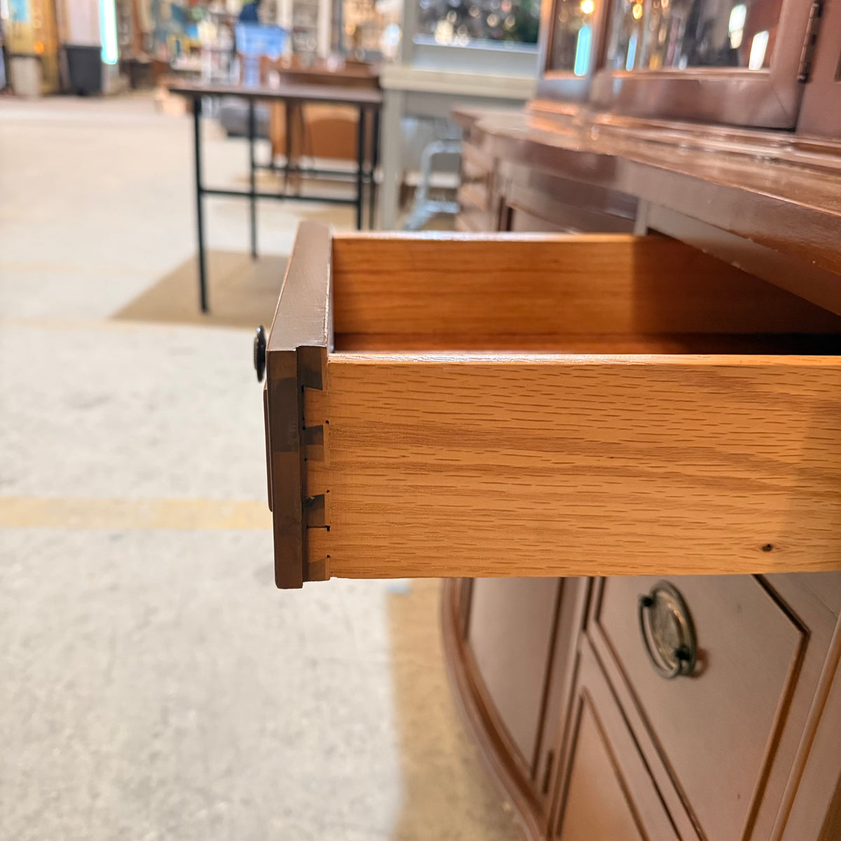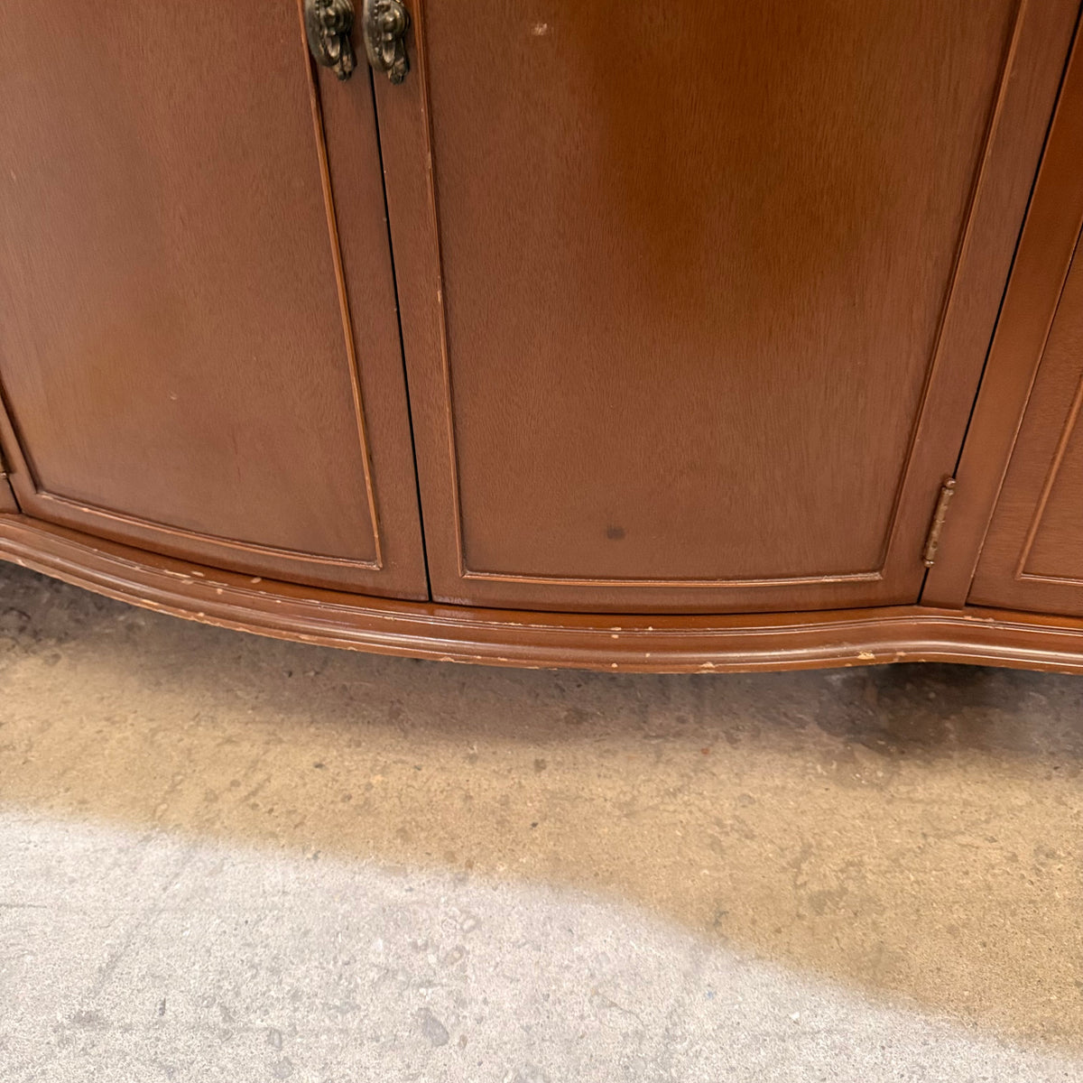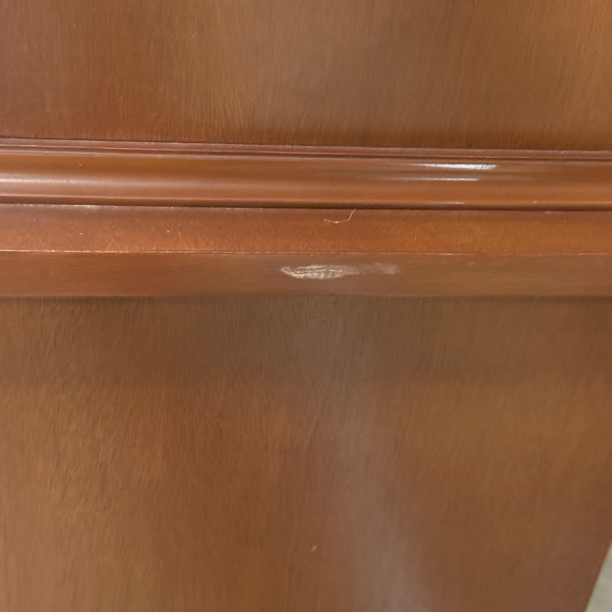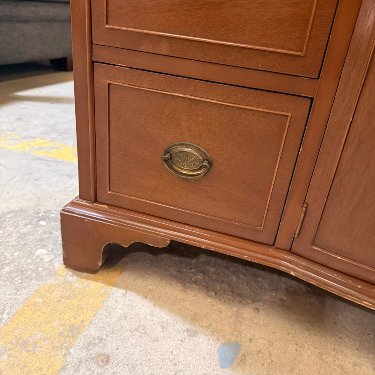 Please note, there are many nicks and chips to this china cabinet, especially along the door and drawer fronts and towards the feet and base (see photos).