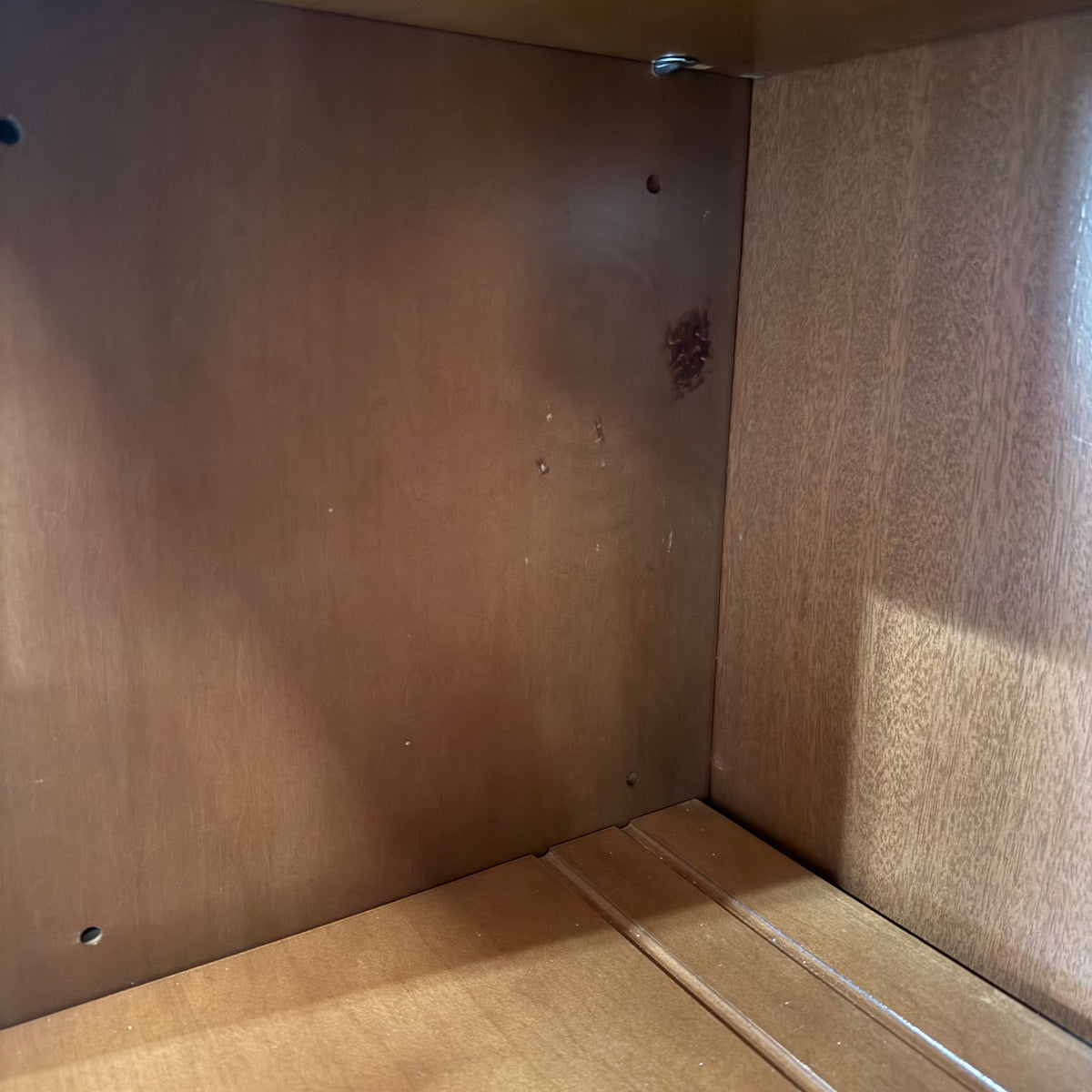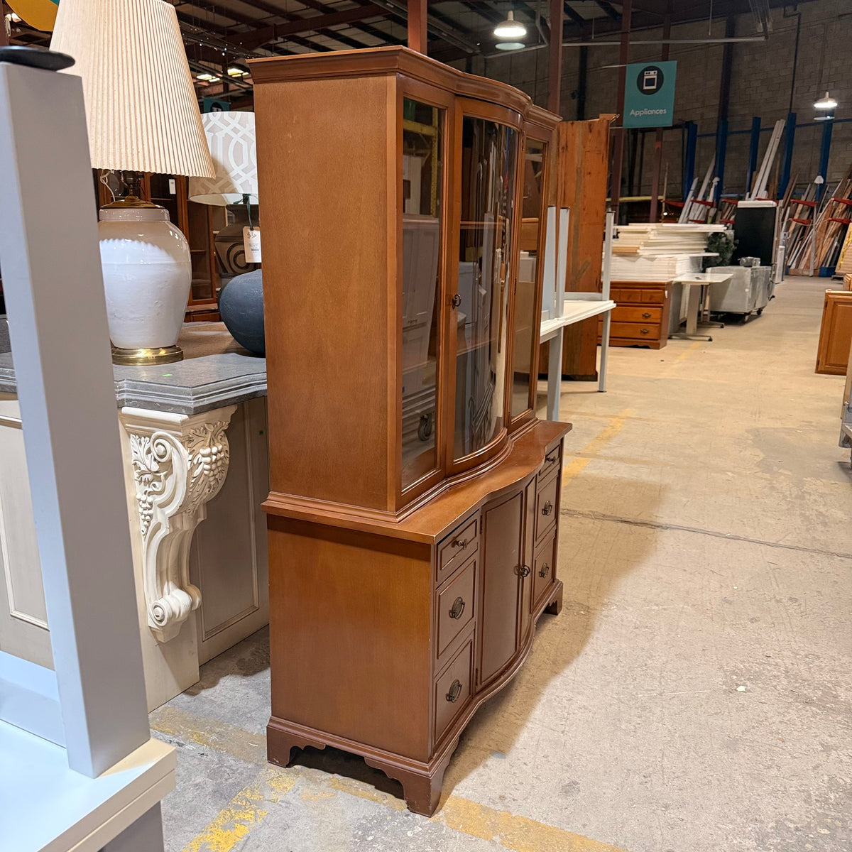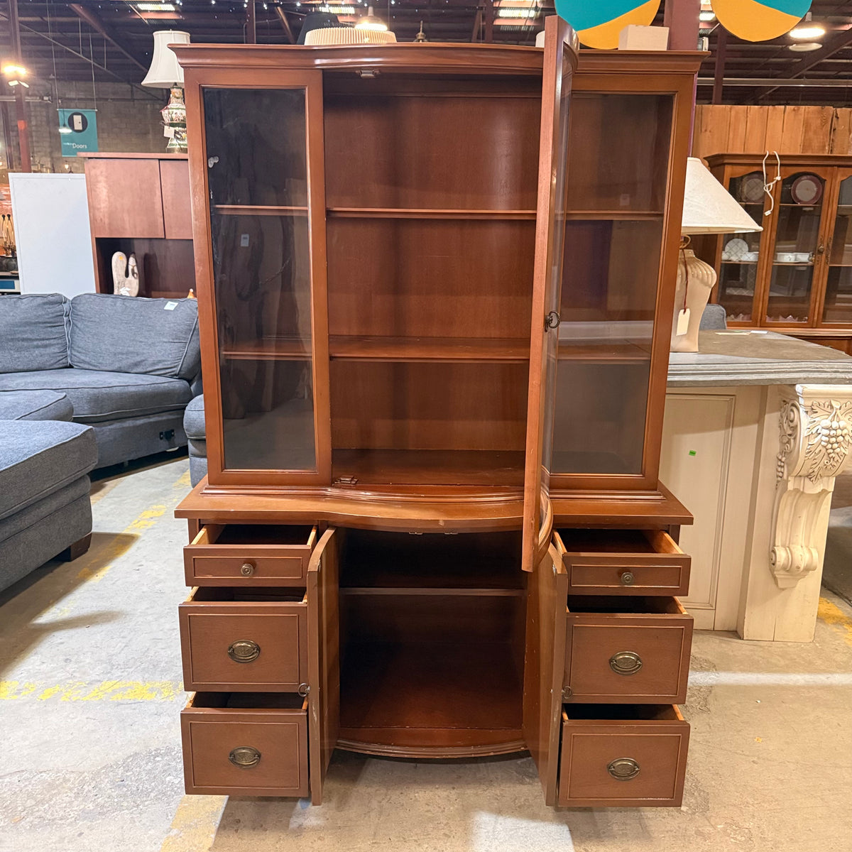 Please note, there are many nicks and chips to this china cabinet, especially along the door and drawer fronts and towards the feet and base (see photos).
