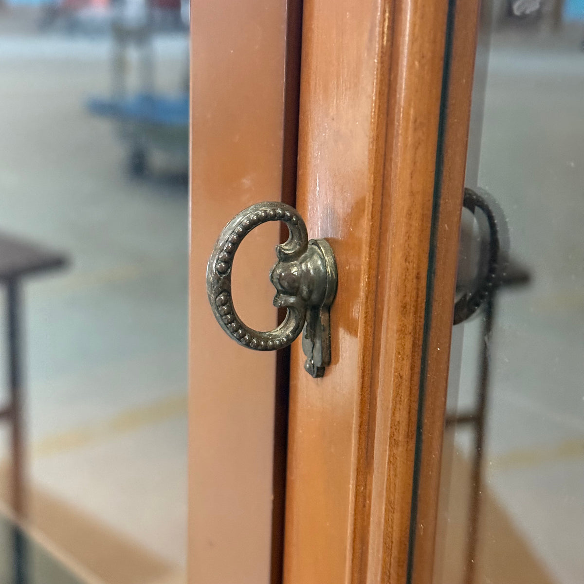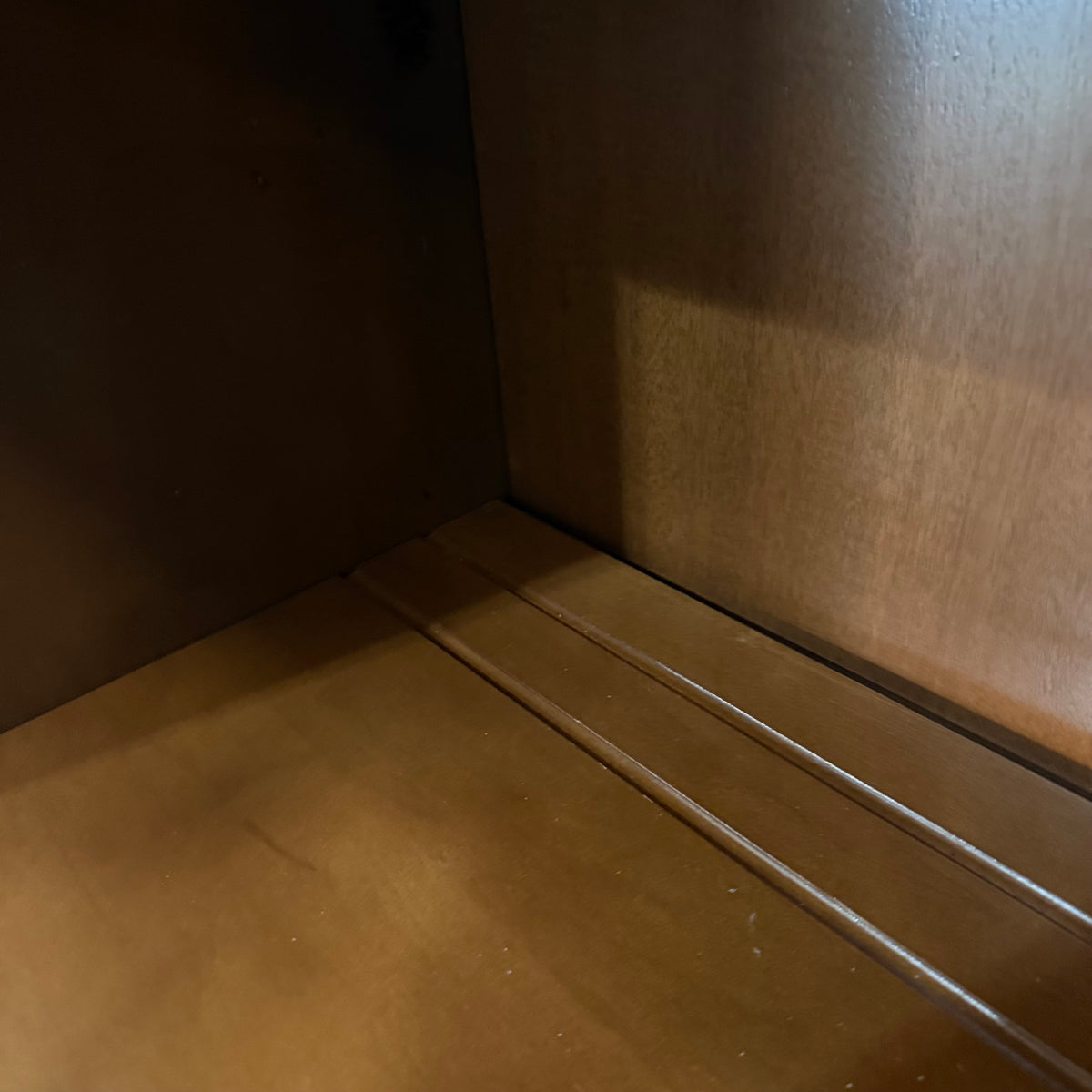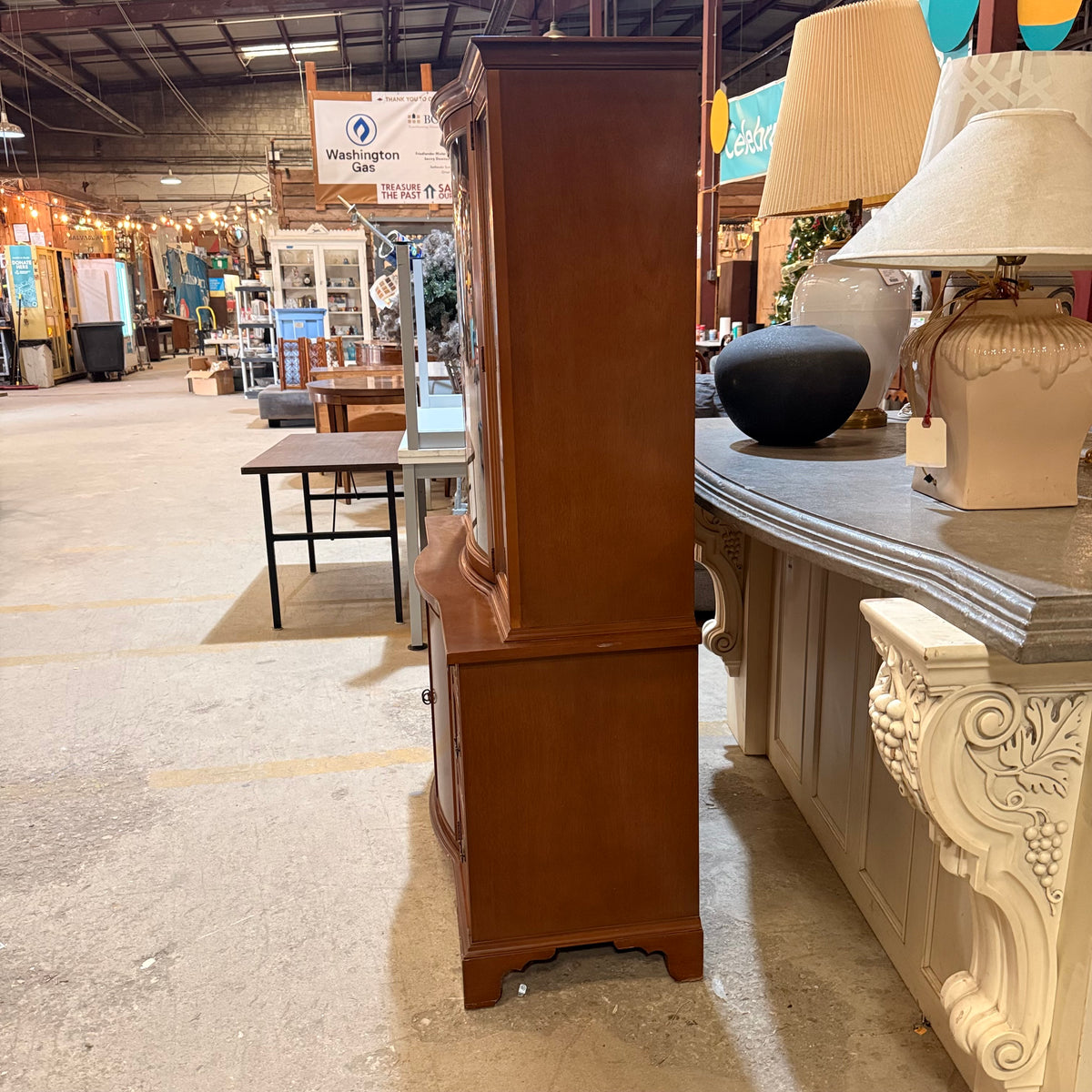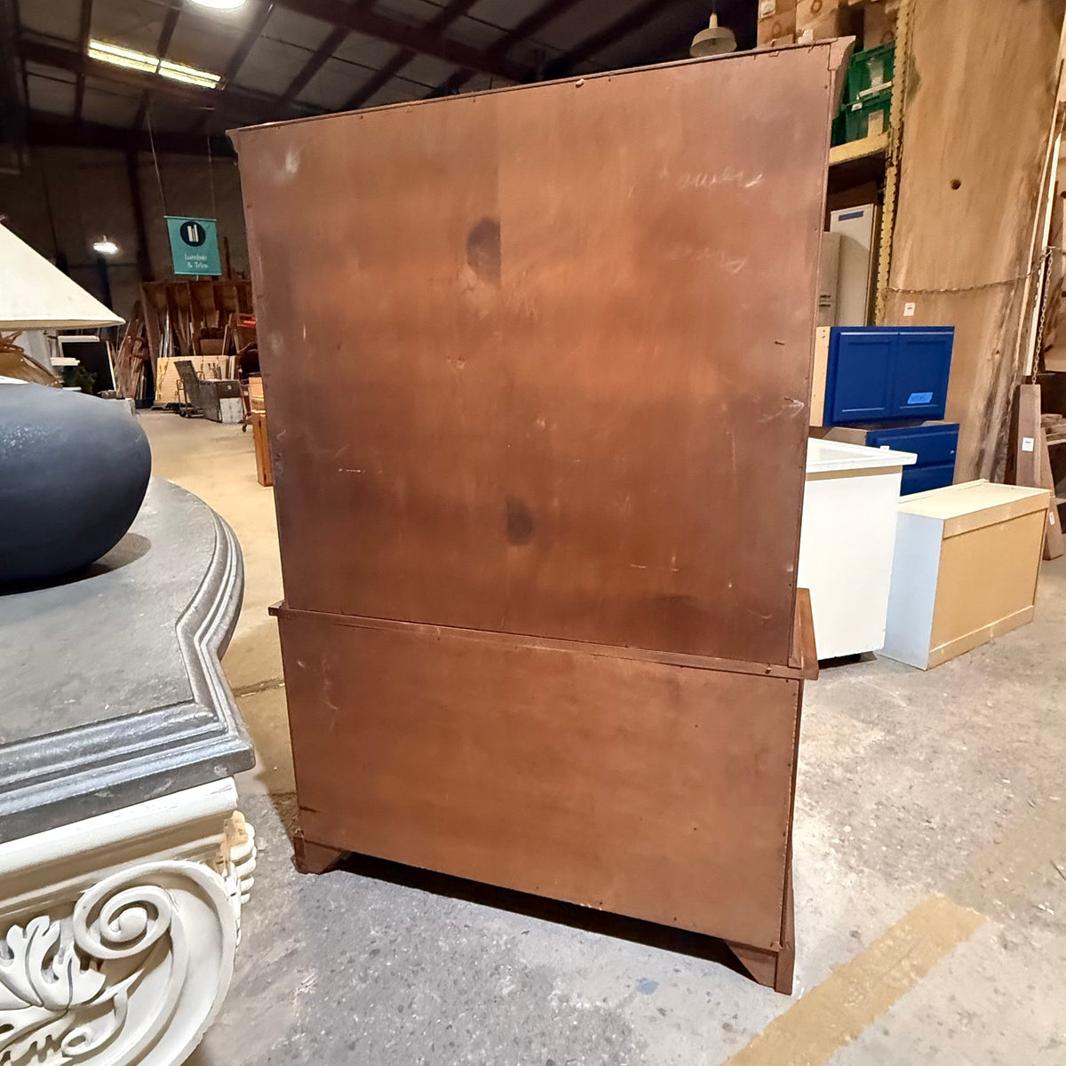 Please note, there are many nicks and chips to this china cabinet, especially along the door and drawer fronts and towards the feet and base (see photos).