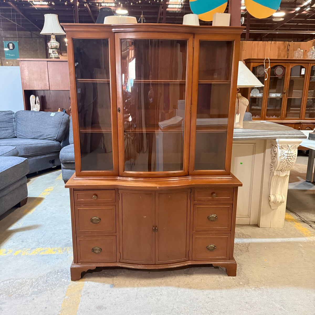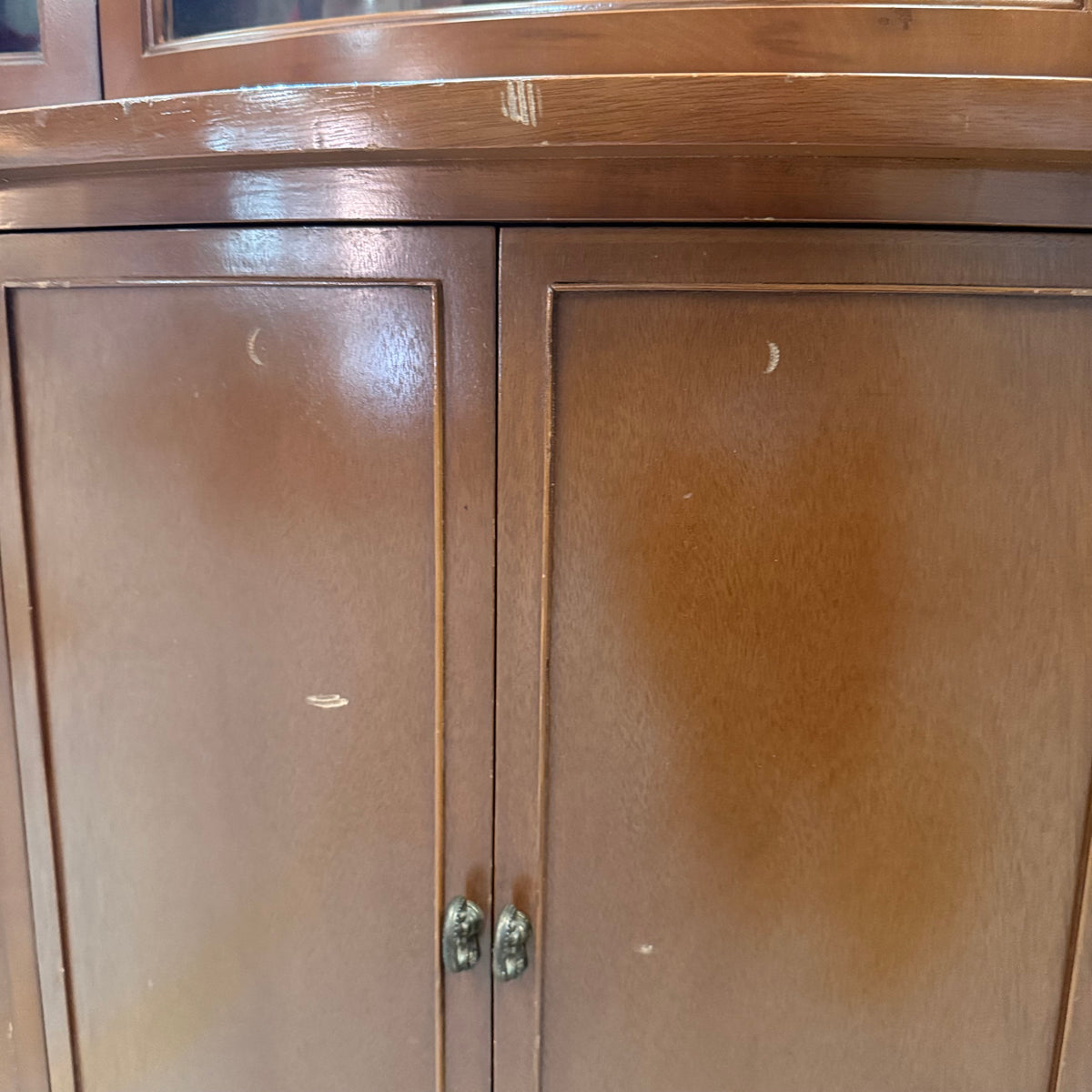 This previously owned, vintage Federal style china cabinet has a display area in the top compartment behind the single glass cabinet door and comes with adjustable shelves containing plate grooves. The bottom compartment features ample storage space in the center cabinet area behind the double doors and three drawers at either side. The cabinet drawers are finished with dovetail joints and stamped brass, oval drawer pulls. The doors are finished with mock key styled, brass cabinet knobs.
