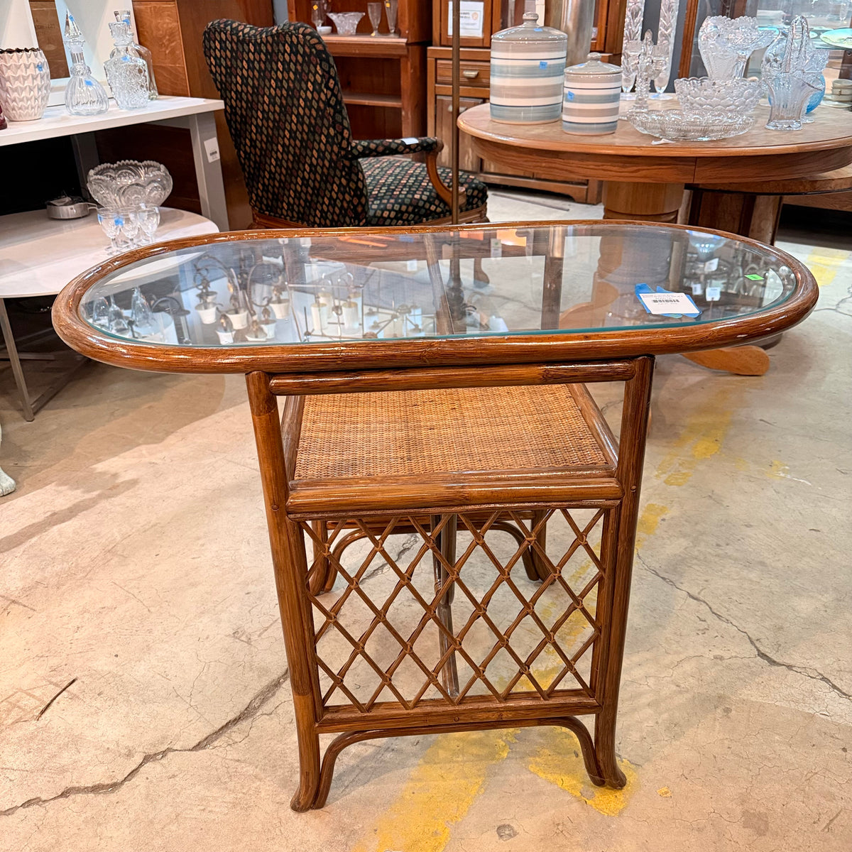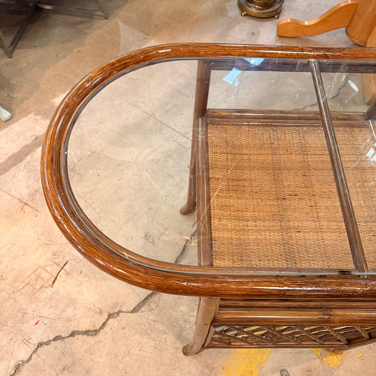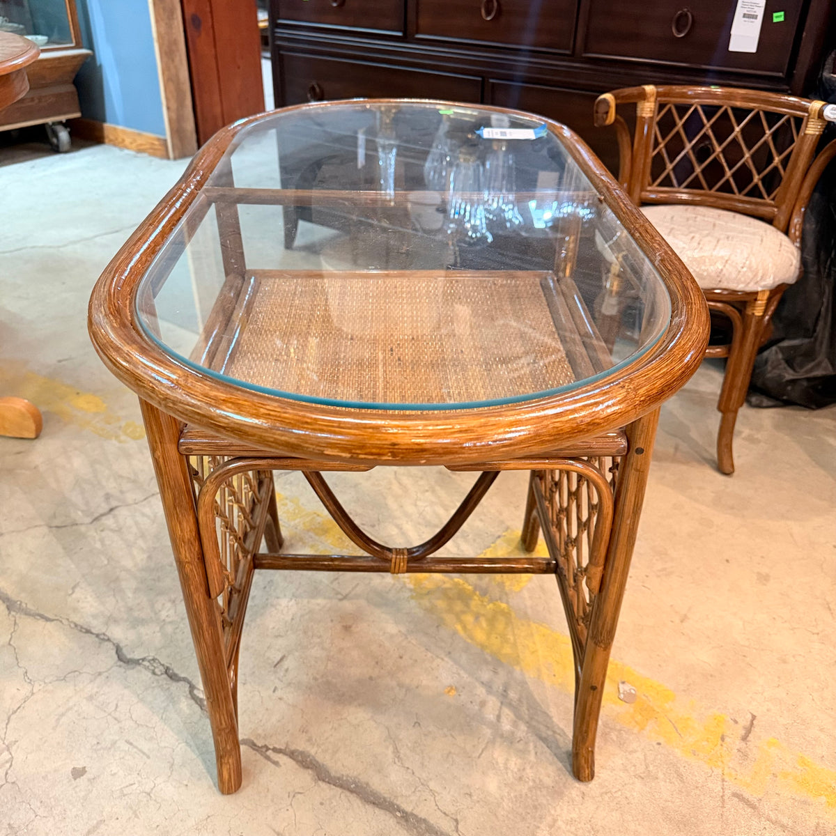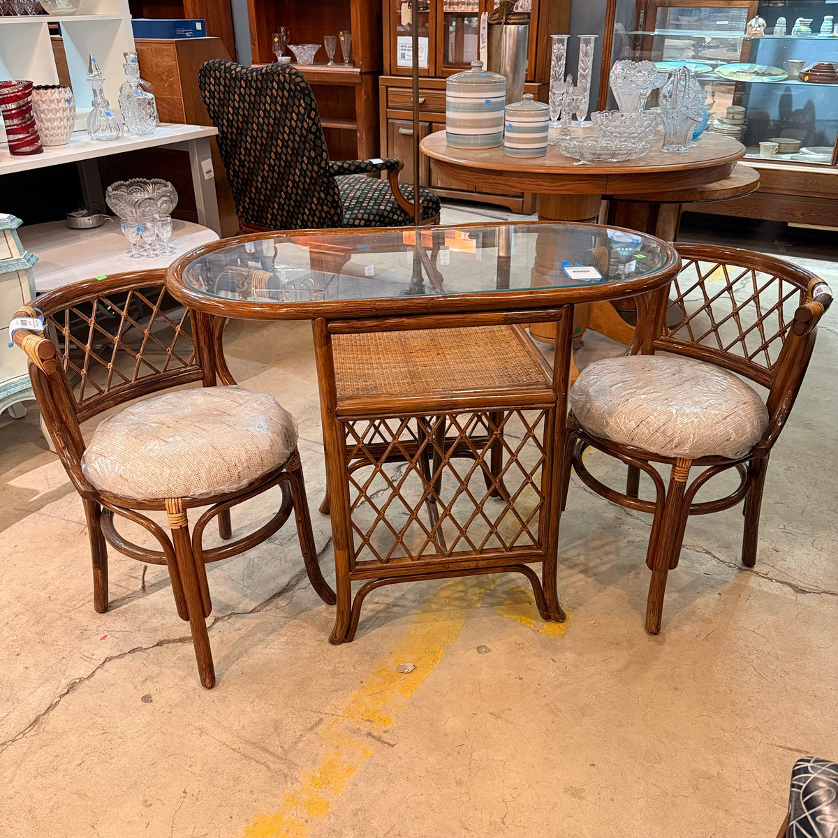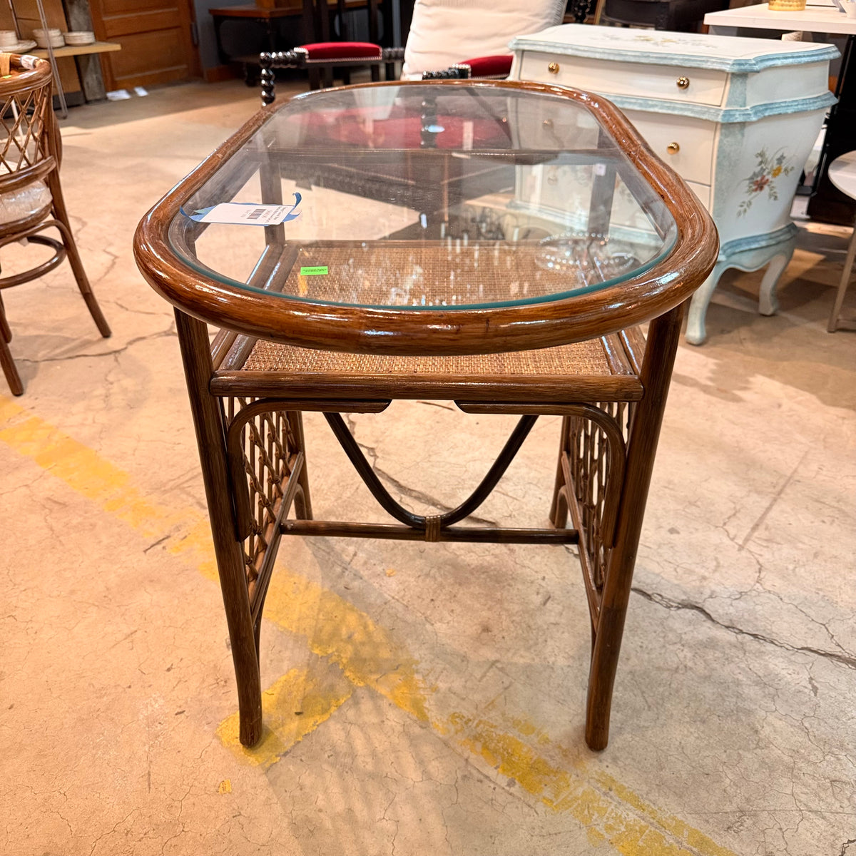 This product is a previously owned vintage, petite, Hollywood Regency style bistro set with a table and two chairs. The table features a curved rattan frame in a natural finish, with an oval glass top insert and a small space underneath to stow away small items. The chairs are also made of curved rattan and finished with weaving. The chairs come with a round, tan upholstered cushion that is wrapped in a thin film of removable plastic.