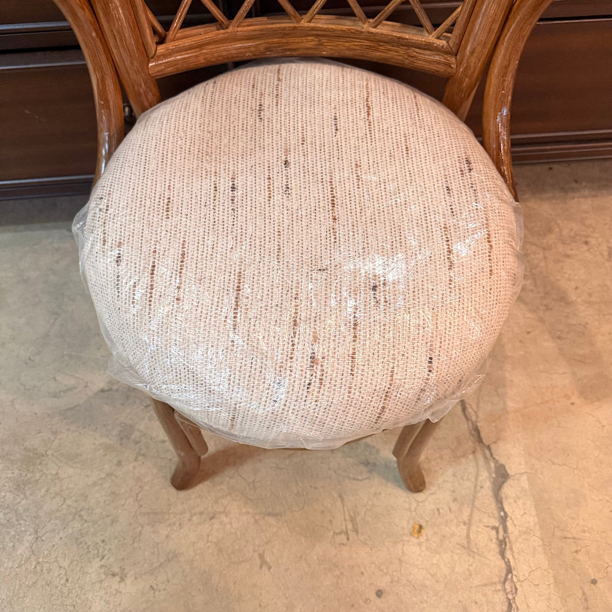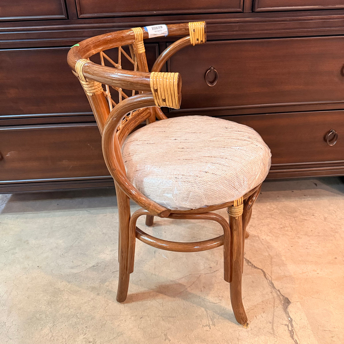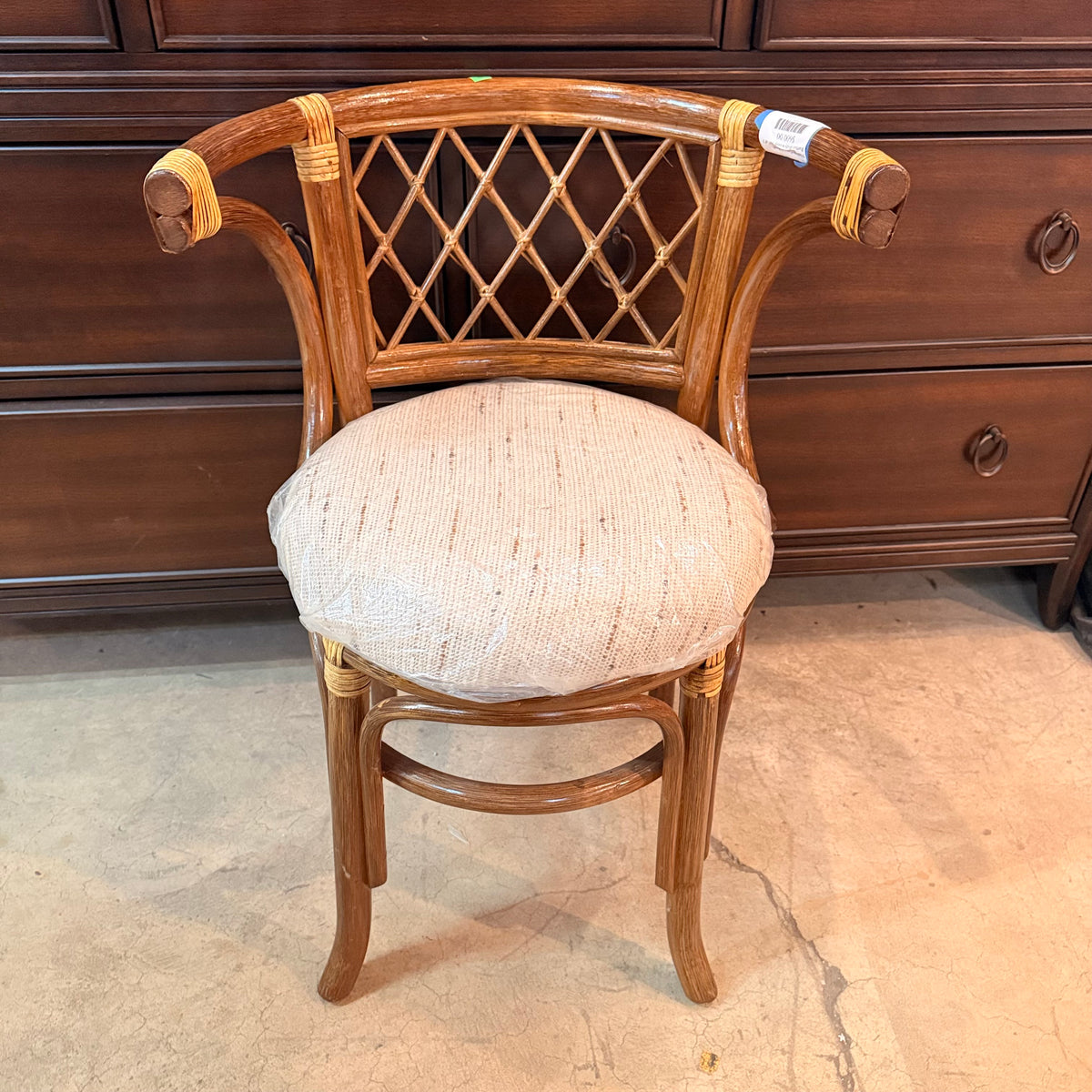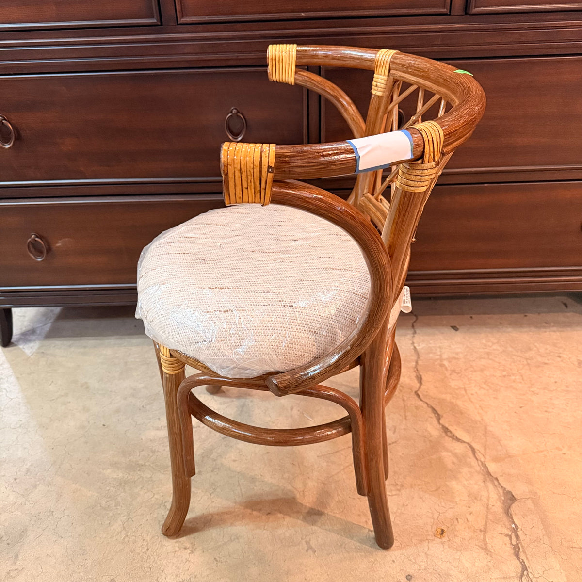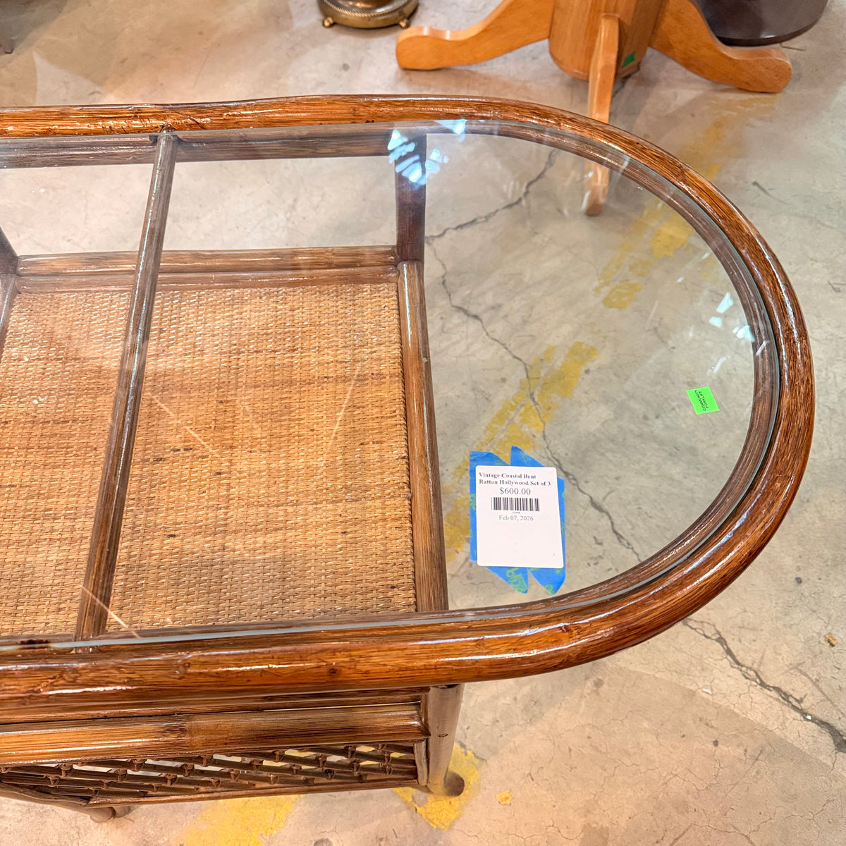 This product is a previously owned vintage, petite, Hollywood Regency style bistro set with a table and two chairs. The table features a curved rattan frame in a natural finish, with an oval glass top insert and a small space underneath to stow away small items. The chairs are also made of curved rattan and finished with weaving. The chairs come with a round, tan upholstered cushion that is wrapped in a thin film of removable plastic.