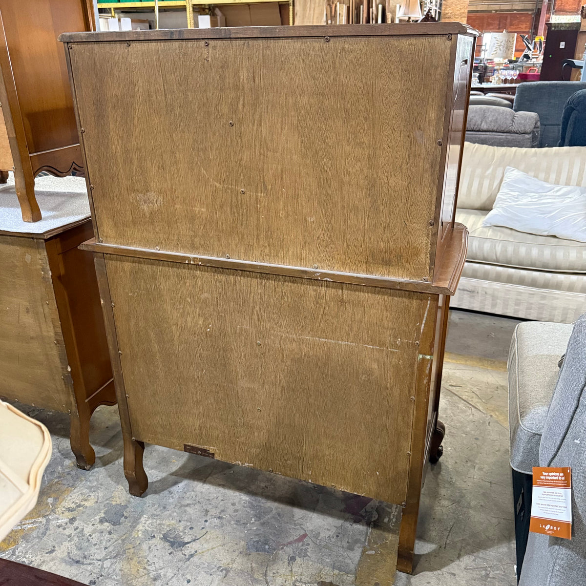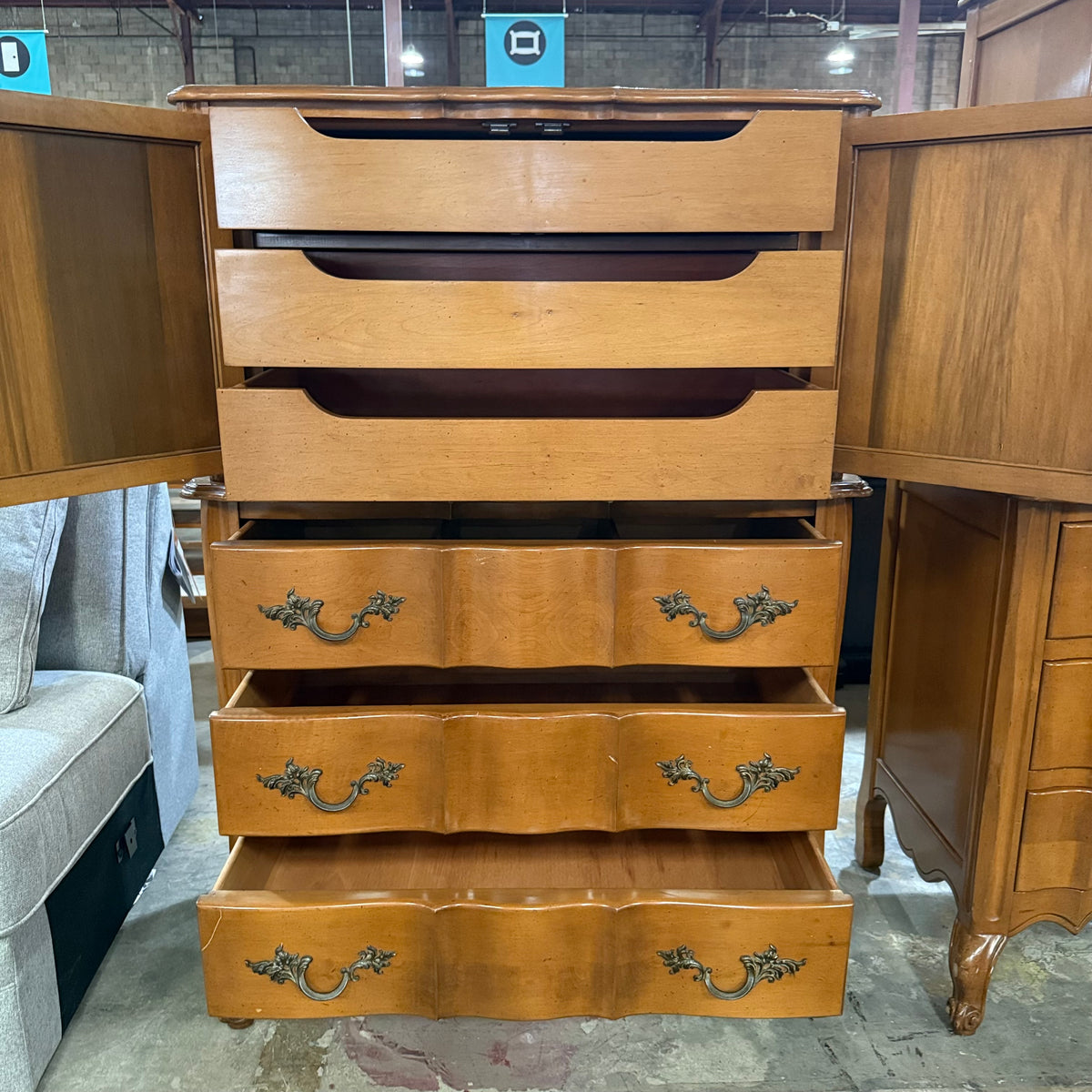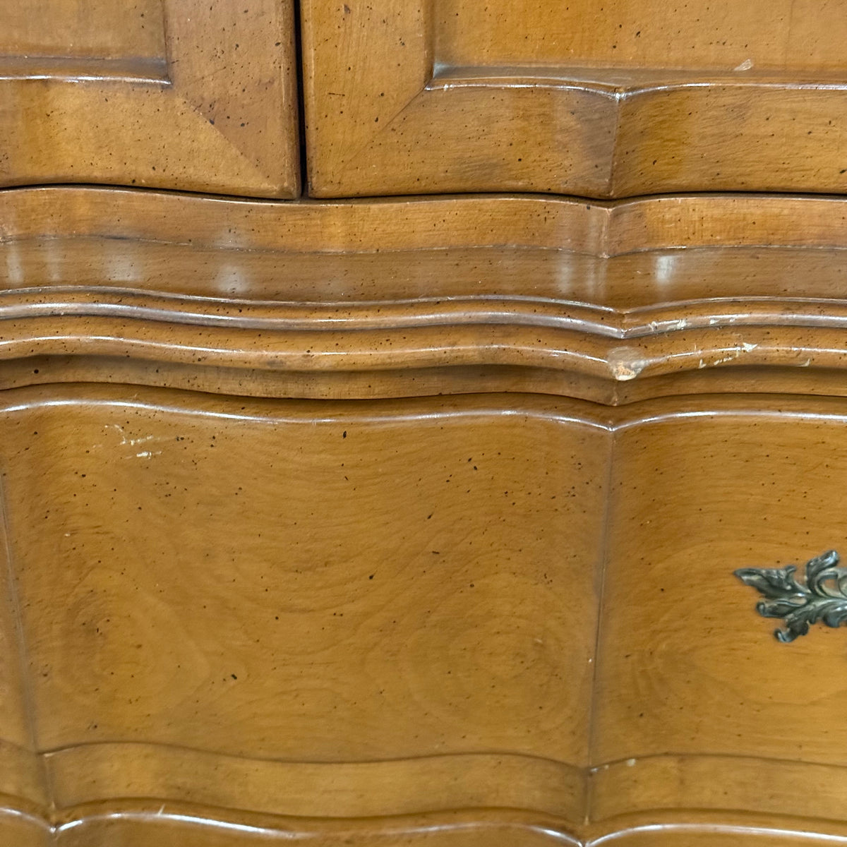 This is a previously owned vintage mid-century carved chest of drawers. It sits on cabriole feet and is made of walnut wood. It features a flat top with scrolled flourishes carved onto the doors and contains three hidden drawers behind the double doors, and three additional spacious drawers below. The drawers are finished with dovetail joints and have French provincial hardware installed.