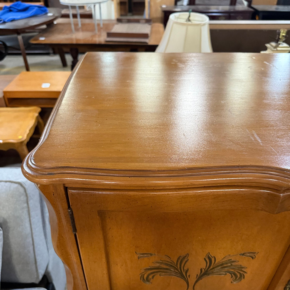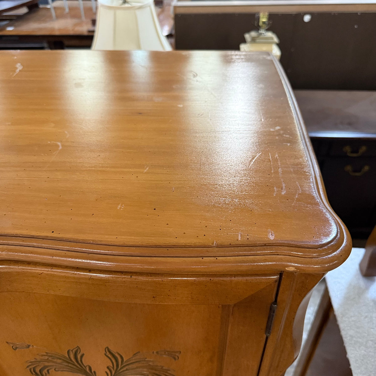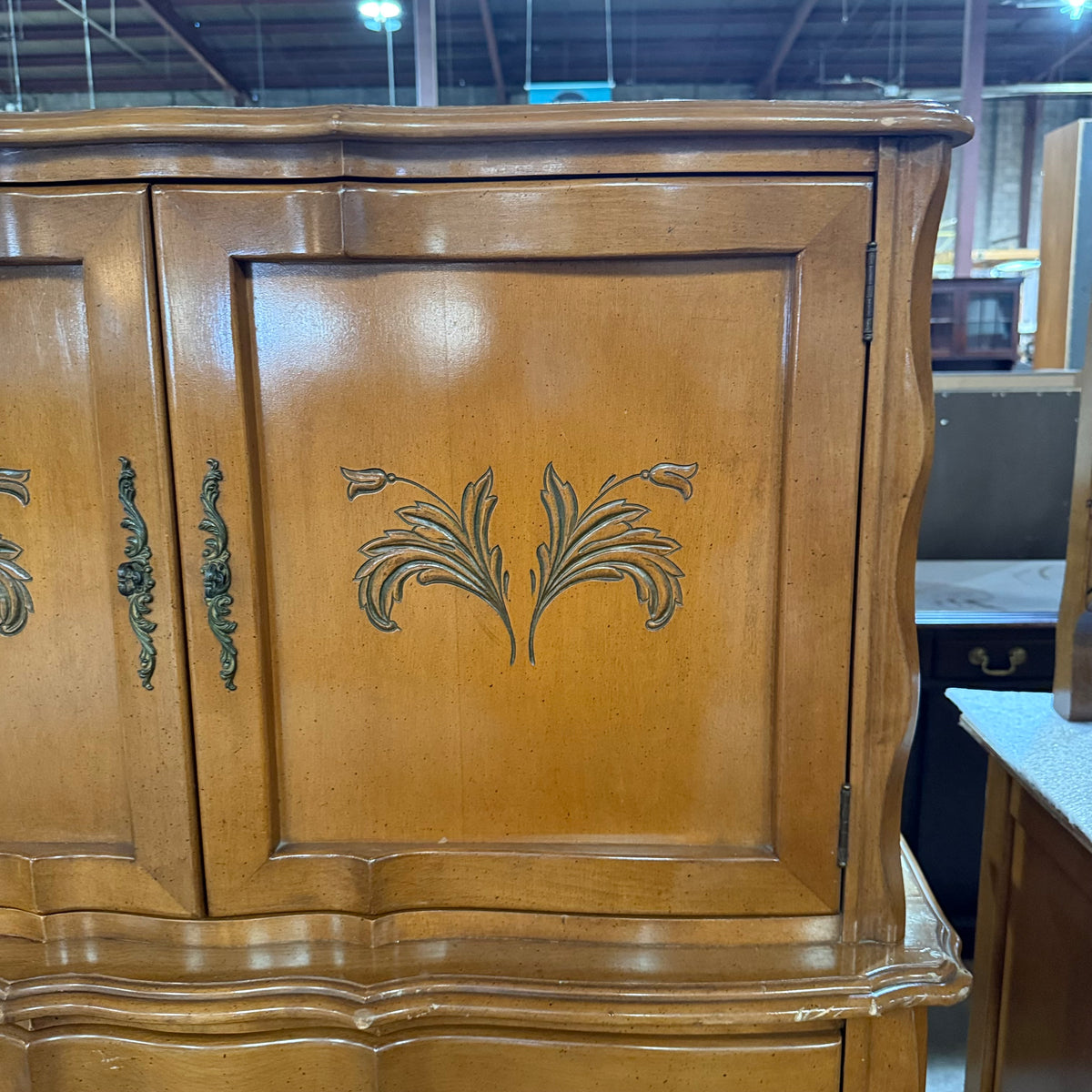 This is a previously owned vintage mid-century carved chest of drawers. It sits on cabriole feet and is made of walnut wood. It features a flat top with scrolled flourishes carved onto the doors and contains three hidden drawers behind the double doors, and three additional spacious drawers below. The drawers are finished with dovetail joints and have French provincial hardware installed.