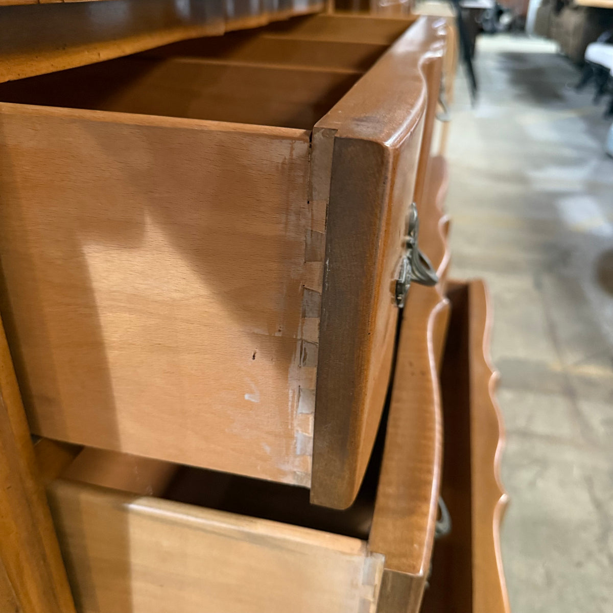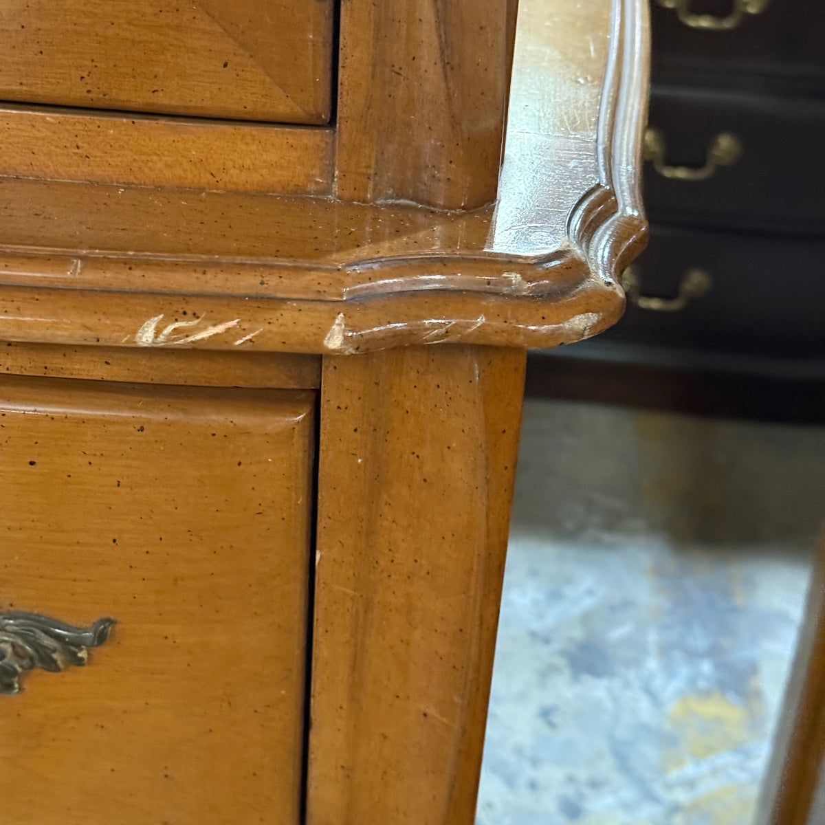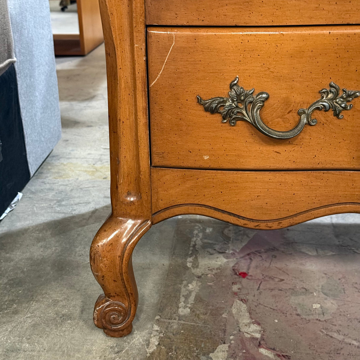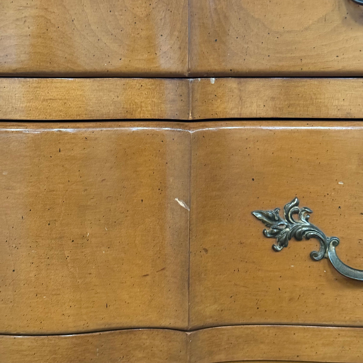 Please note, there are a few chips towards the front of this dresser. There are also a couple of light and deep scratches along the surface top and some chipping towards the feet (see photos).