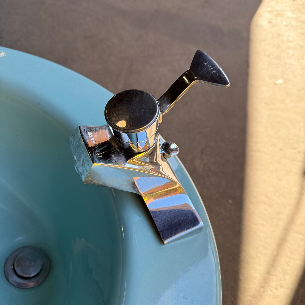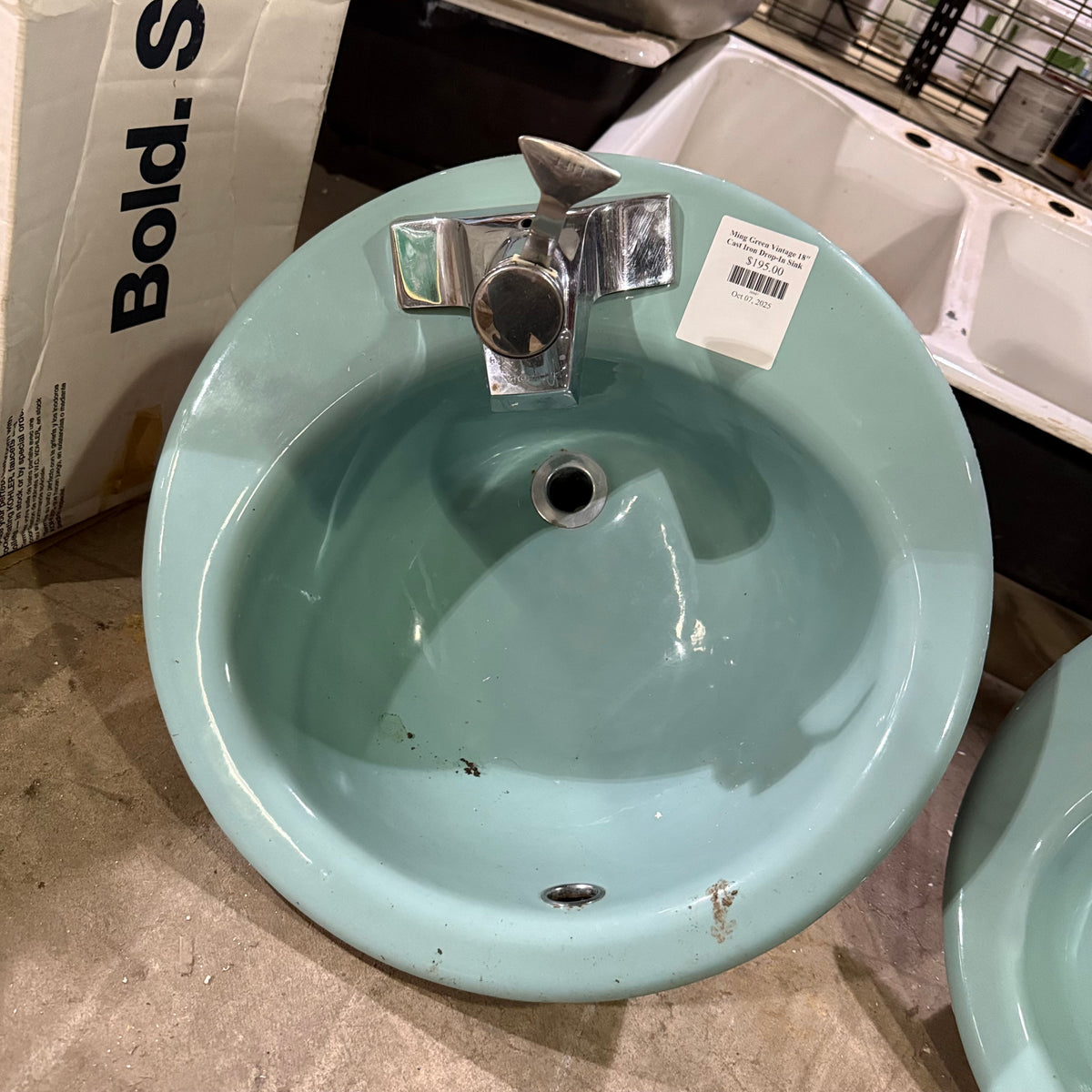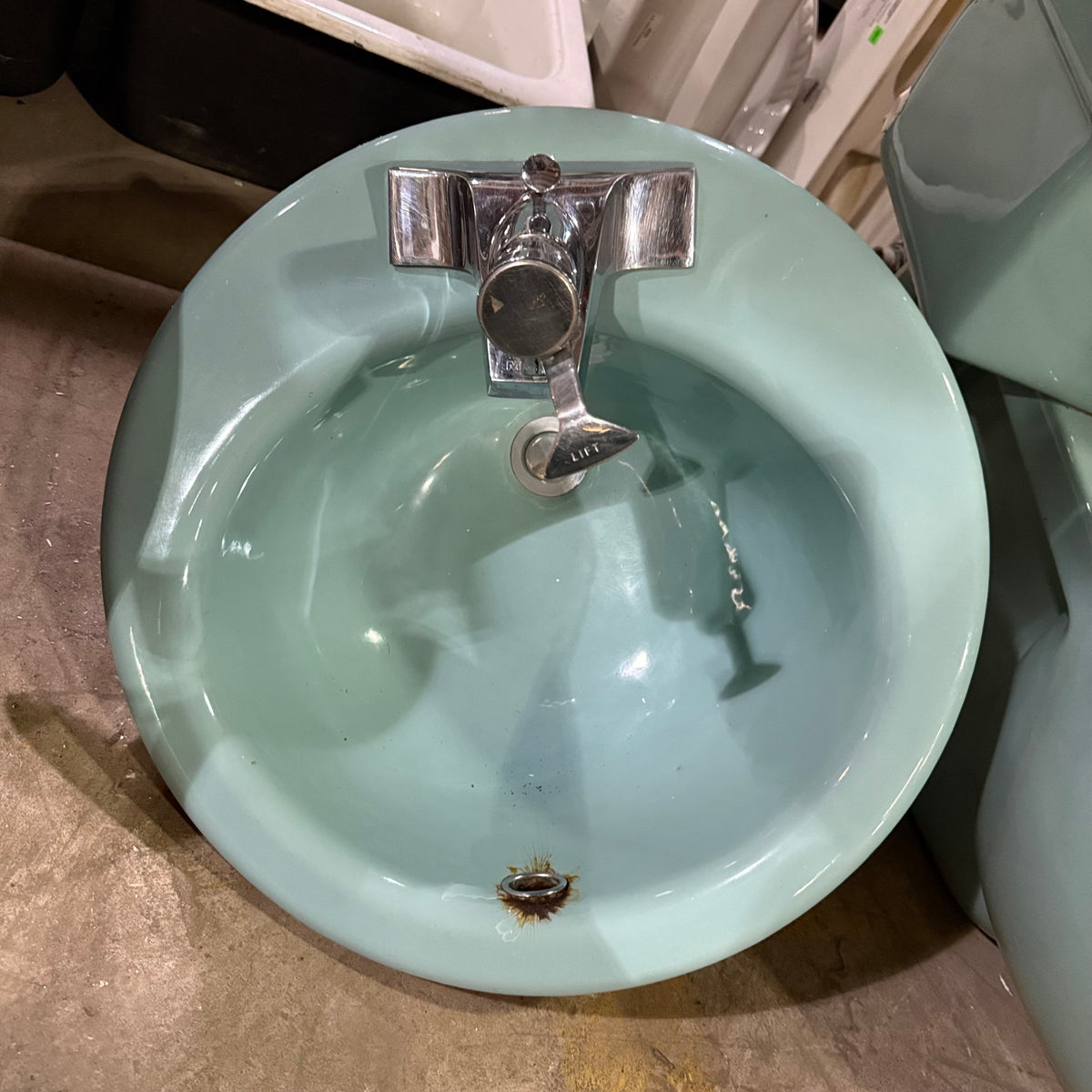 This is a previously owned, round drop-in cast iron bathroom sink finished in a Ming Green glazed finish. It comes with chrome Moen faucet hardware included.
