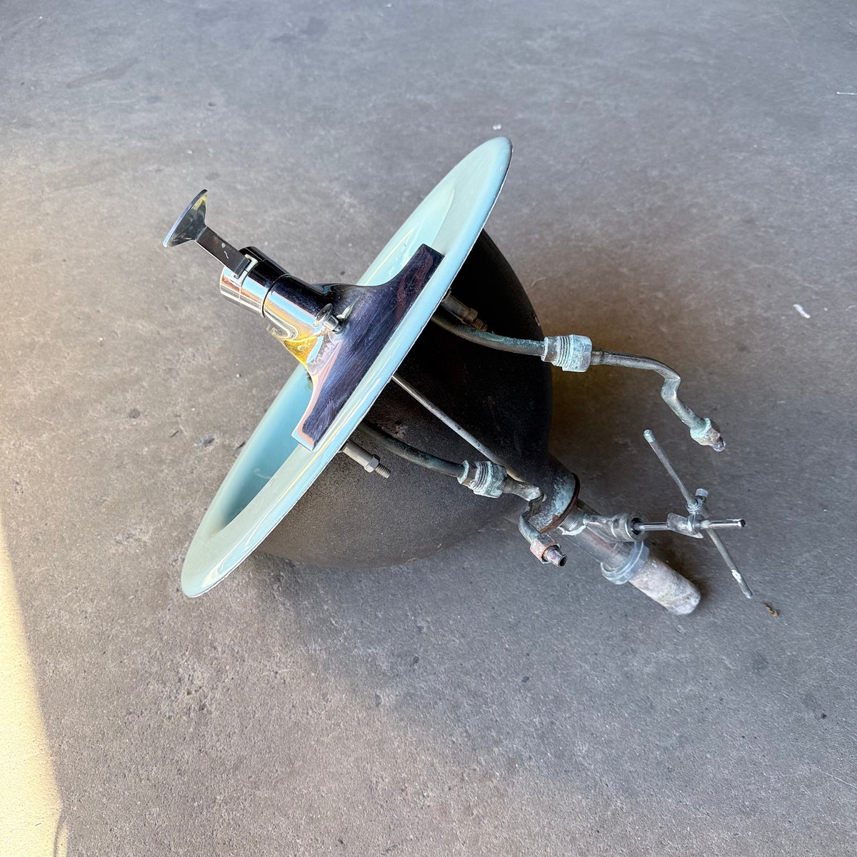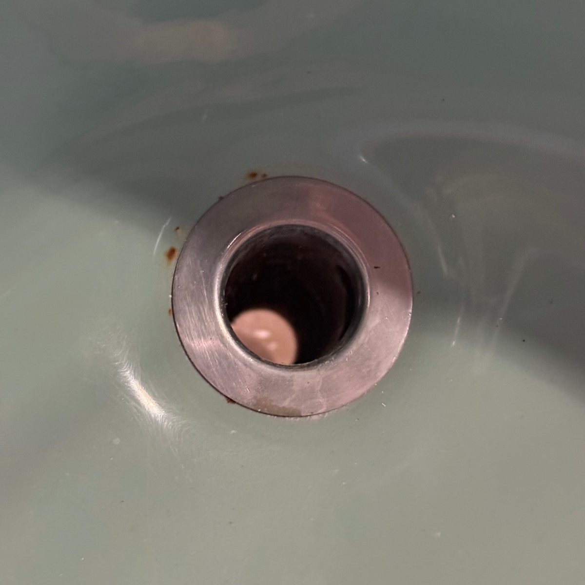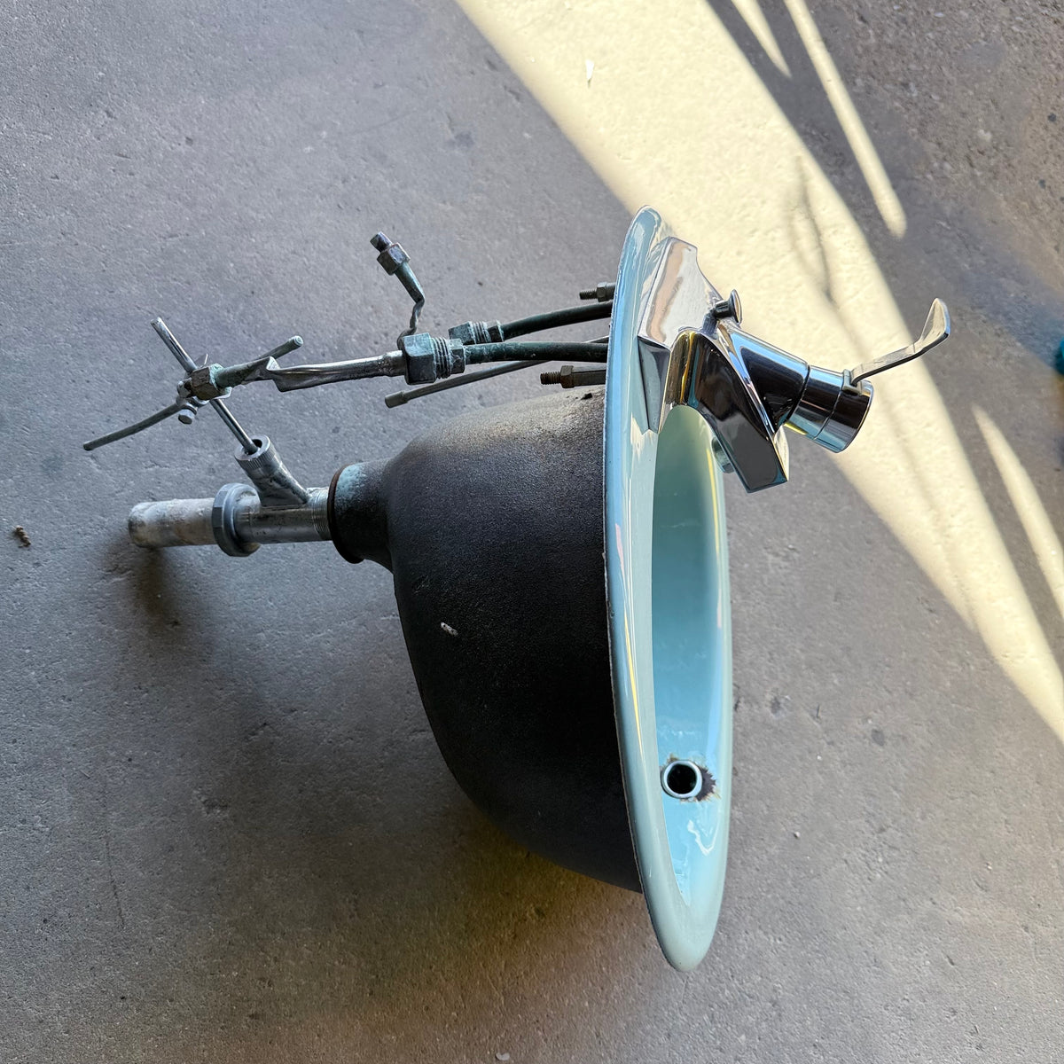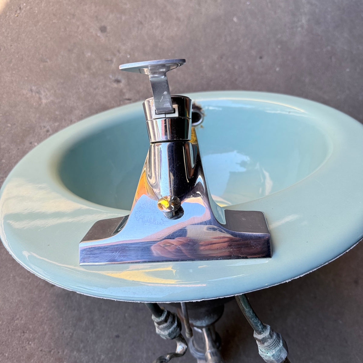 This is a previously owned, round drop-in cast iron bathroom sink finished in a Ming Green glazed finish. It comes with chrome Moen faucet hardware included.