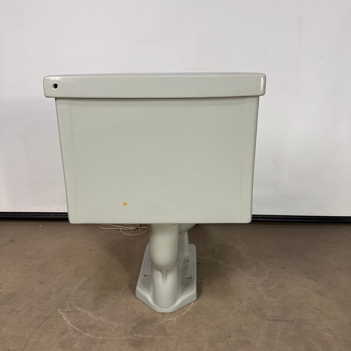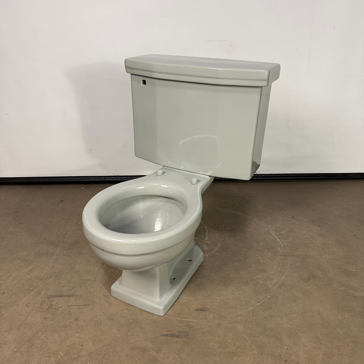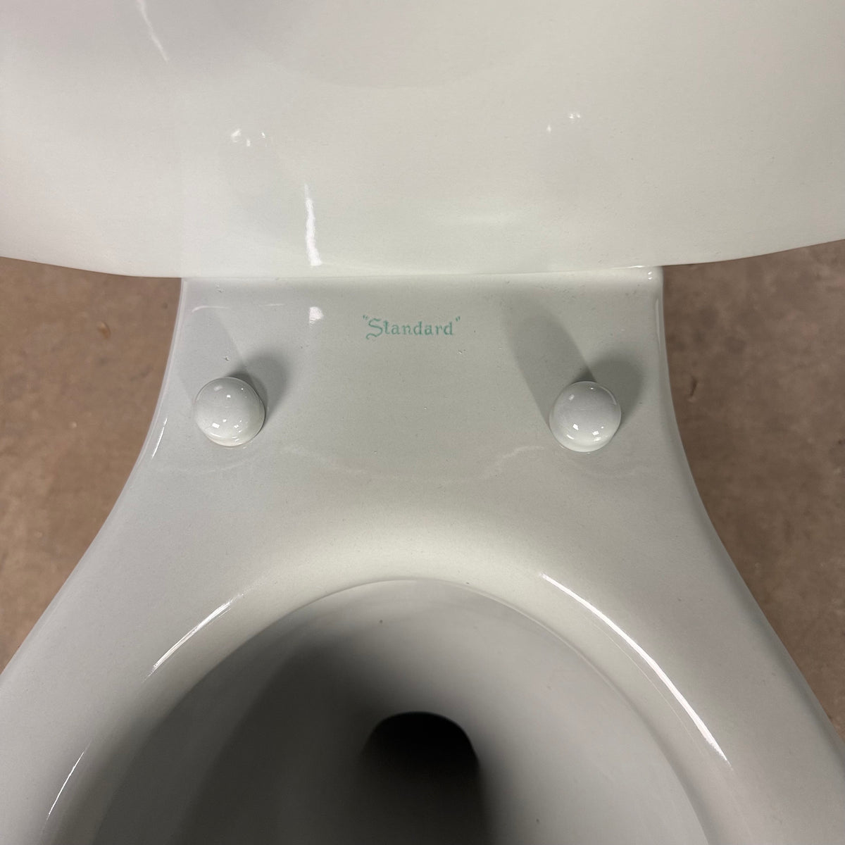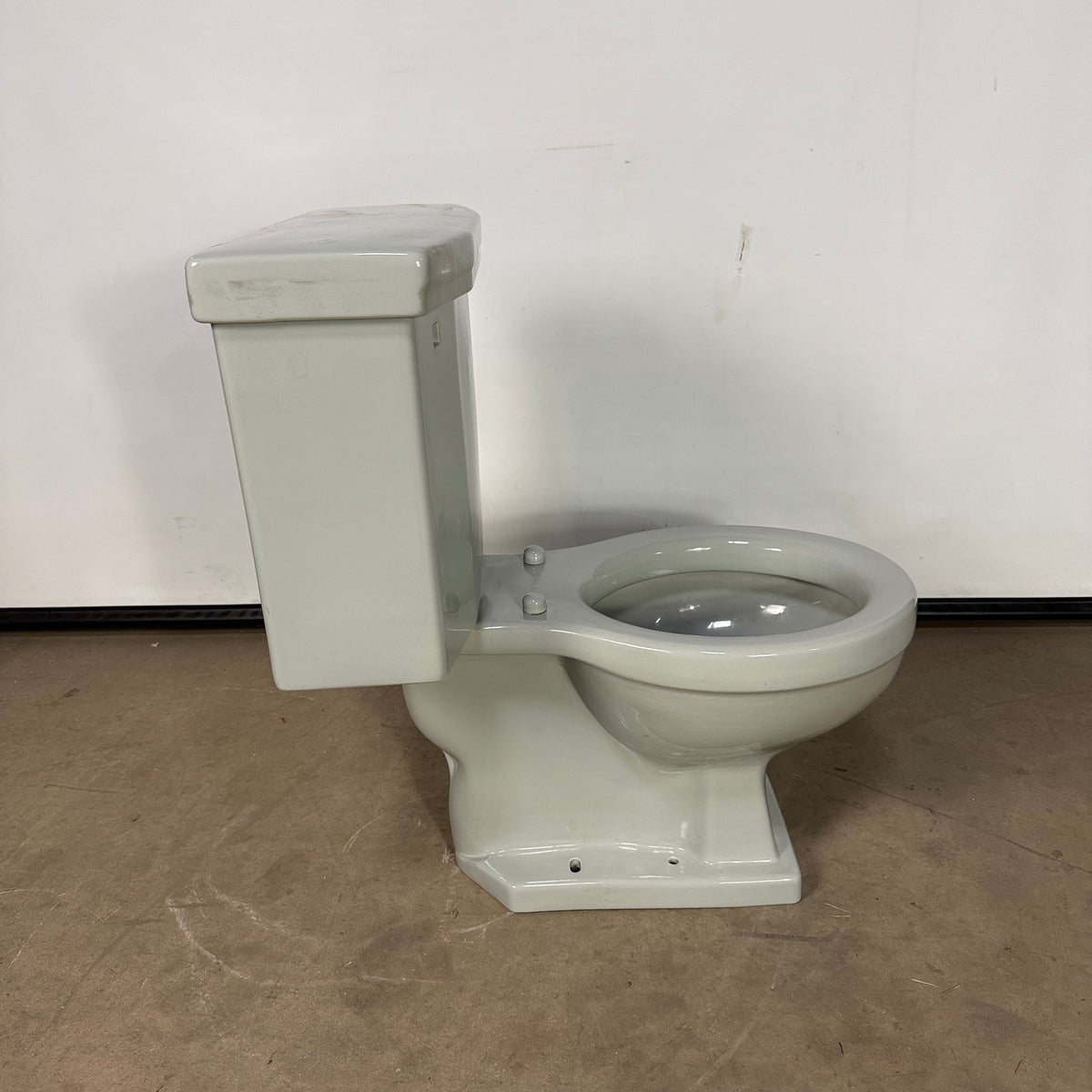 This is a vintage Standard brand two piece toilet in a ice grey finish. This toilet does not come with a toilet seat or any hardware included besides the bolts to keep it connected between the tank and the bowl. There is a gasket included, but it is not the right fit and will need to be replaced. The stamp inside the tank and lid is dated 1956.