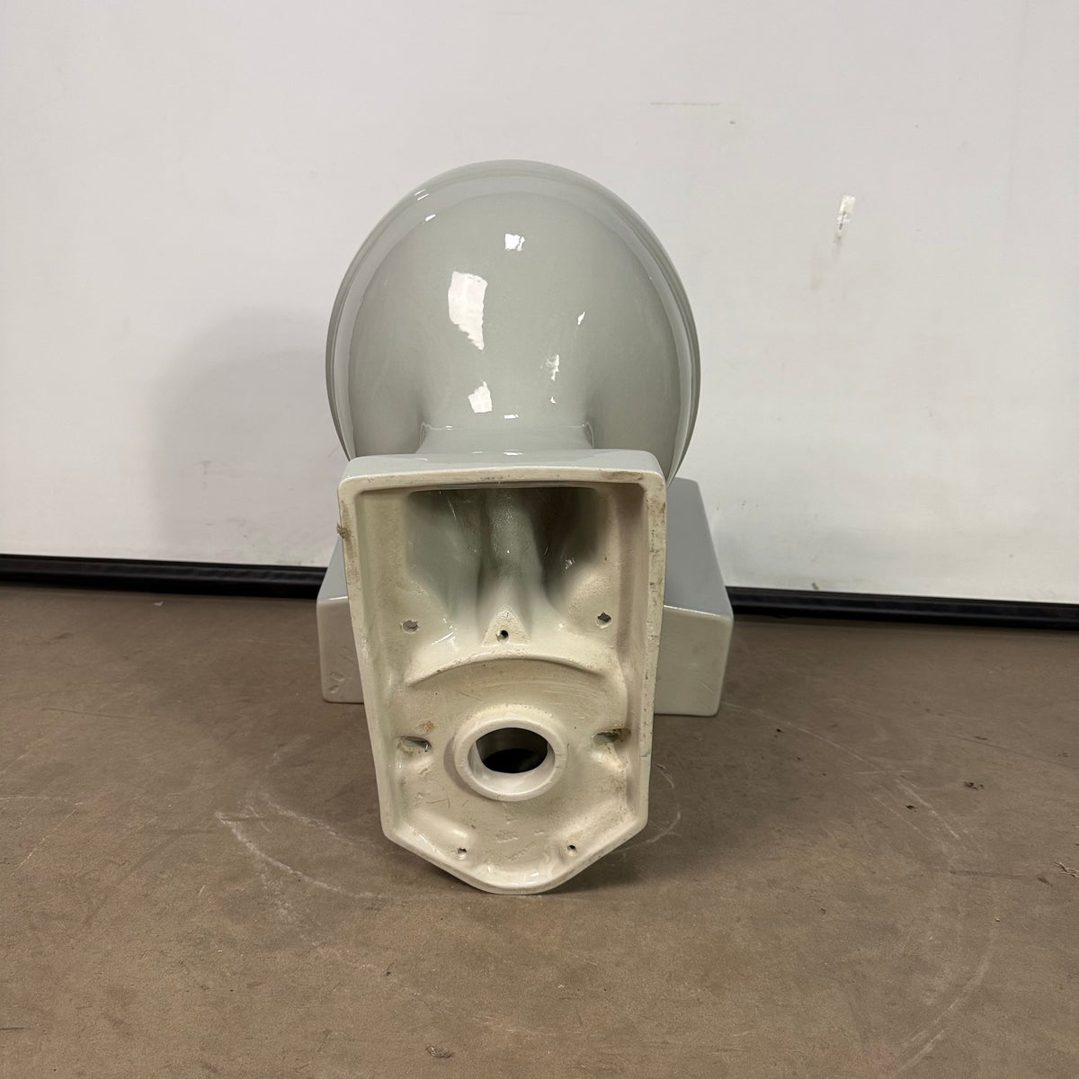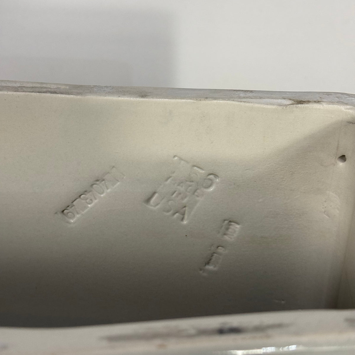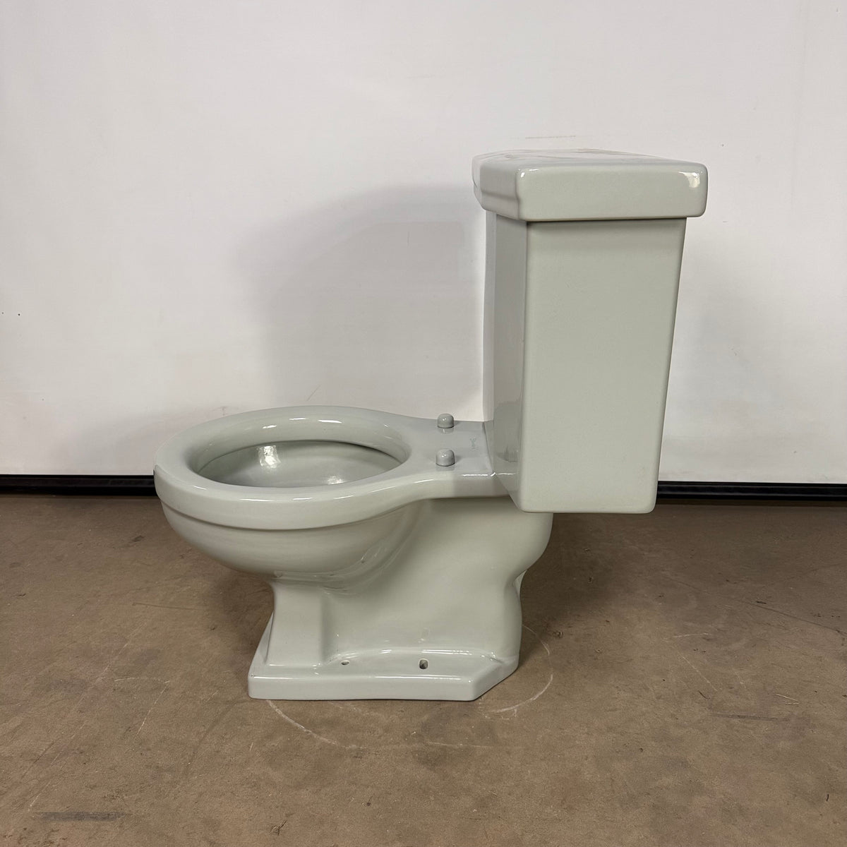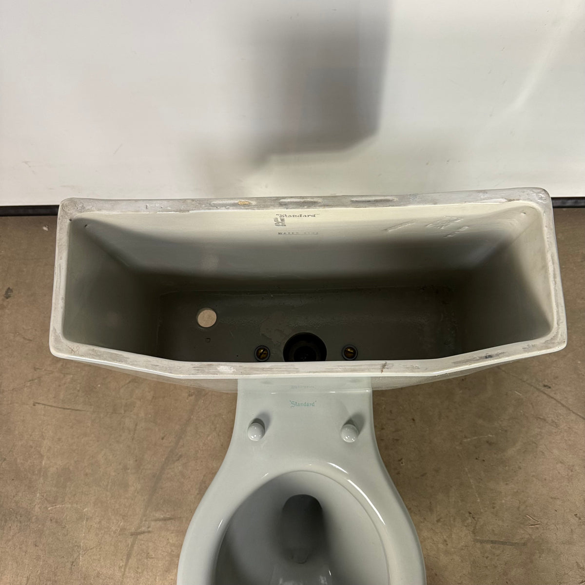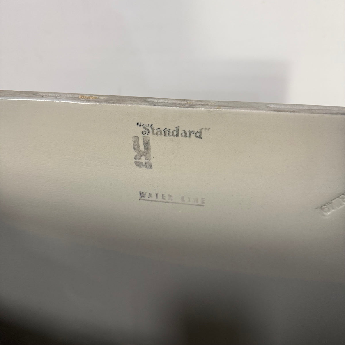 This is a vintage Standard brand two piece toilet in a ice grey finish. This toilet does not come with a toilet seat or any hardware included besides the bolts to keep it connected between the tank and the bowl. There is a gasket included, but it is not the right fit and will need to be replaced. The stamp inside the tank and lid is dated 1956.
