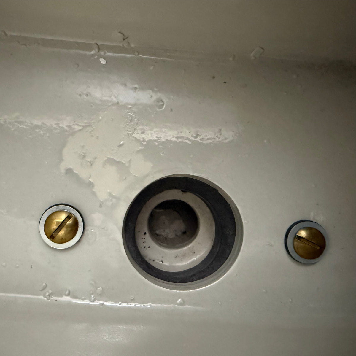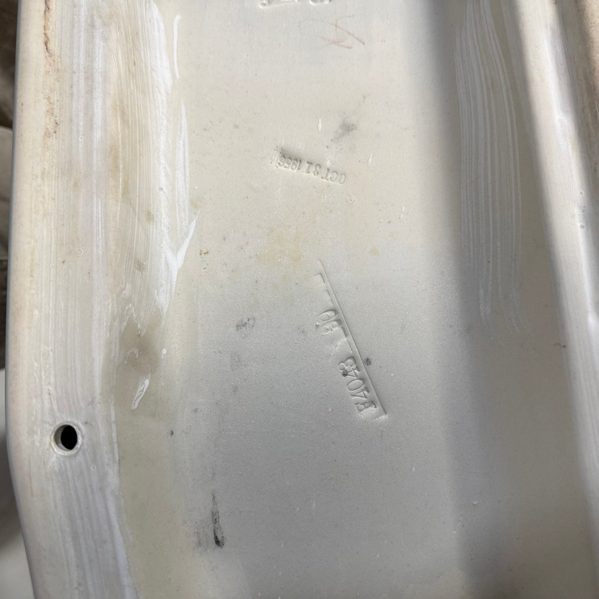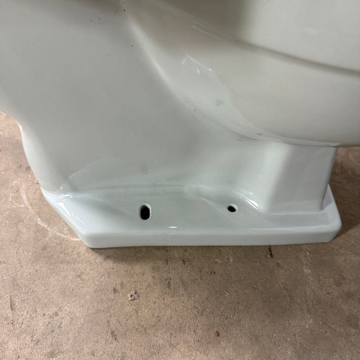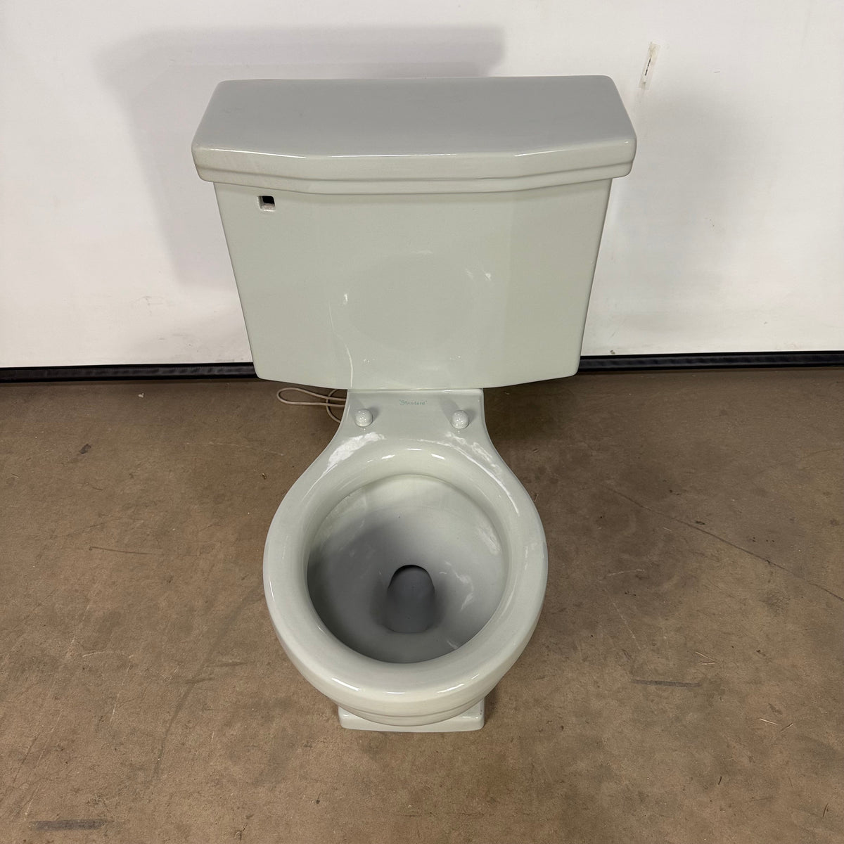 This is a vintage Standard brand two piece toilet in a ice grey finish. This toilet does not come with a toilet seat or any hardware included besides the bolts to keep it connected between the tank and the bowl. There is a gasket included, but it is not the right fit and will need to be replaced. The stamp inside the tank and lid is dated 1956.