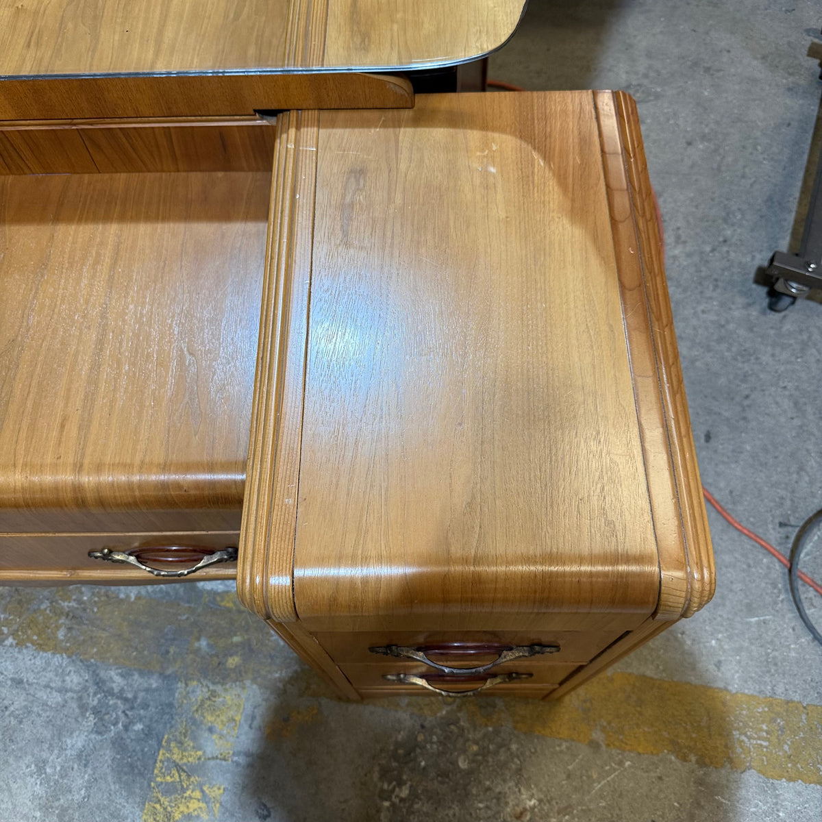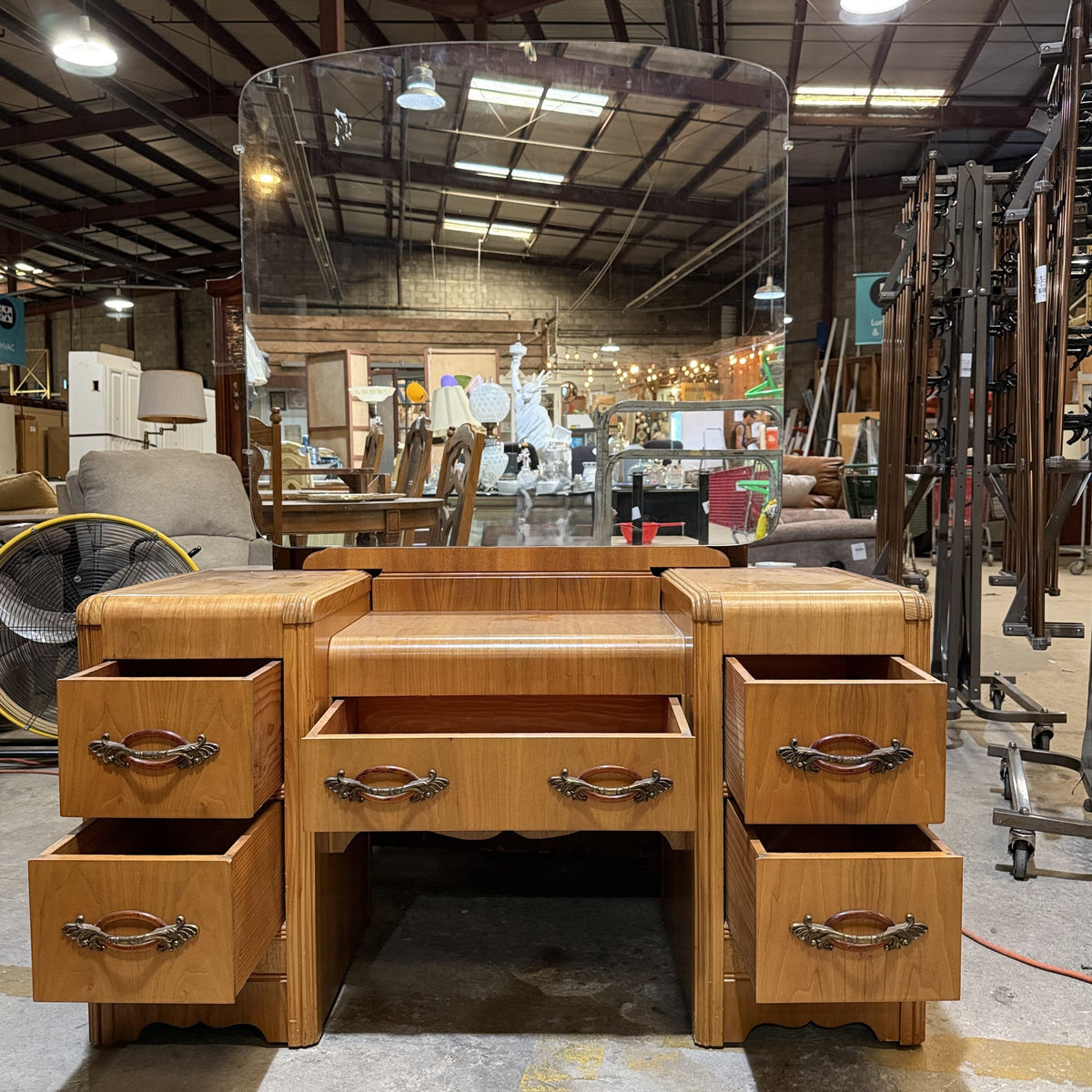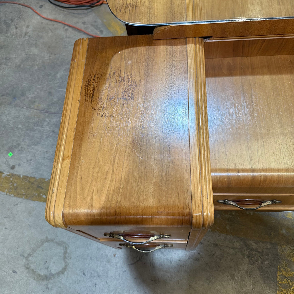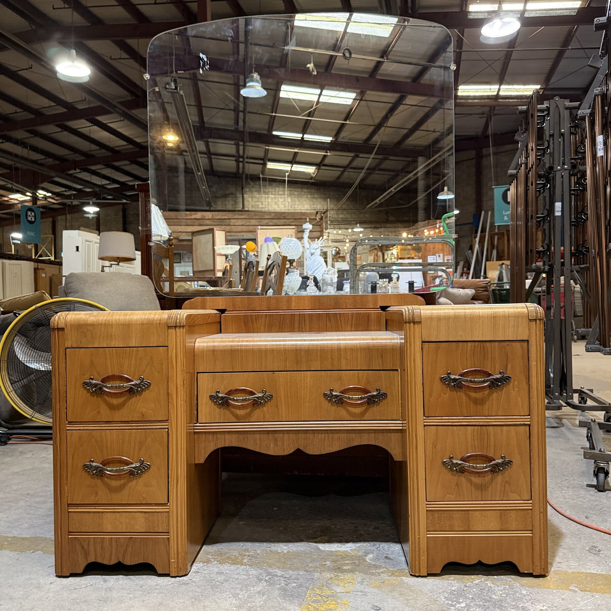 This vintage vanity features a waterfall edge across the front and a large mirror attached to the back. The base contains a small center drawer and a stack of two larger drawers at either side with brass pull hardware. The mirror can be detached for moving.