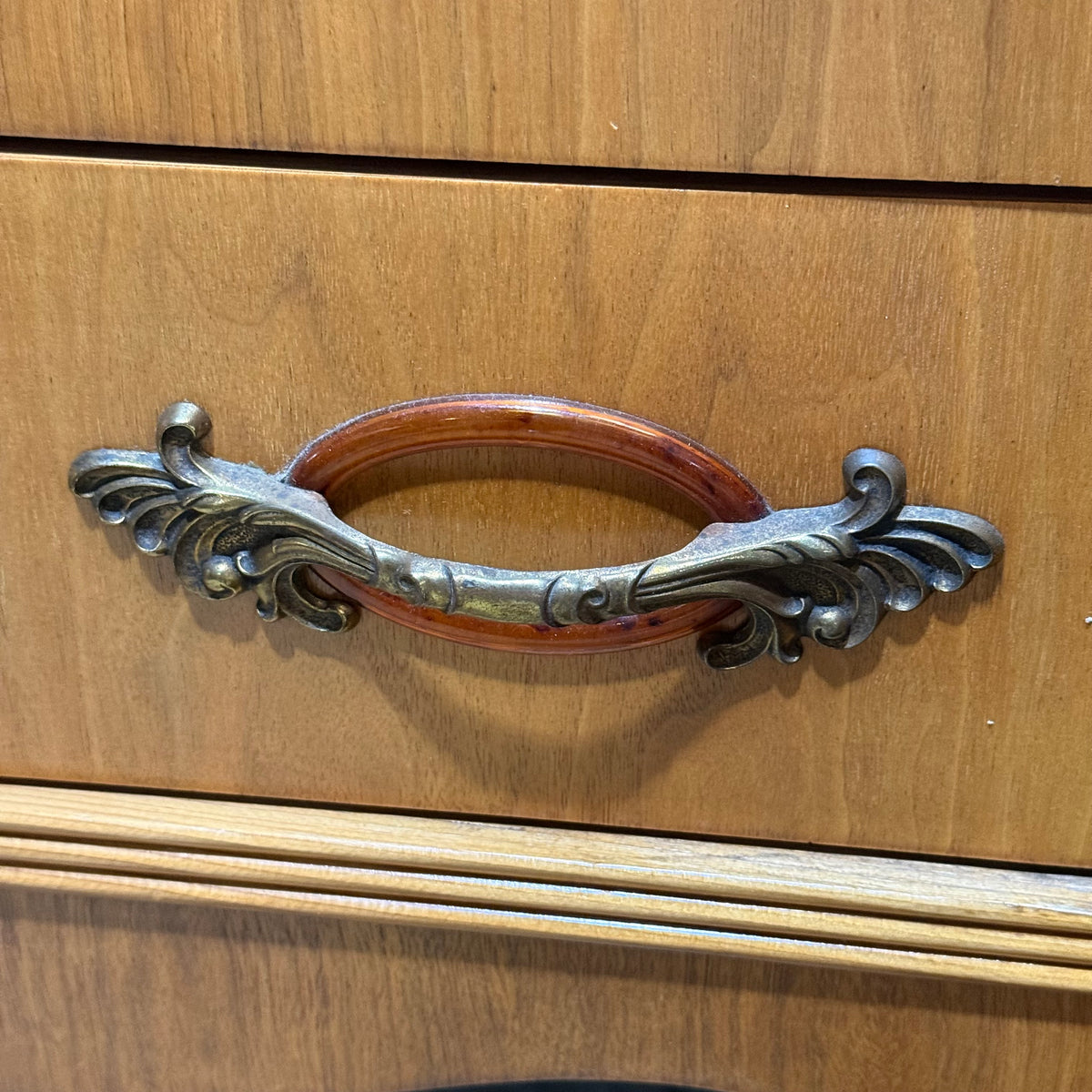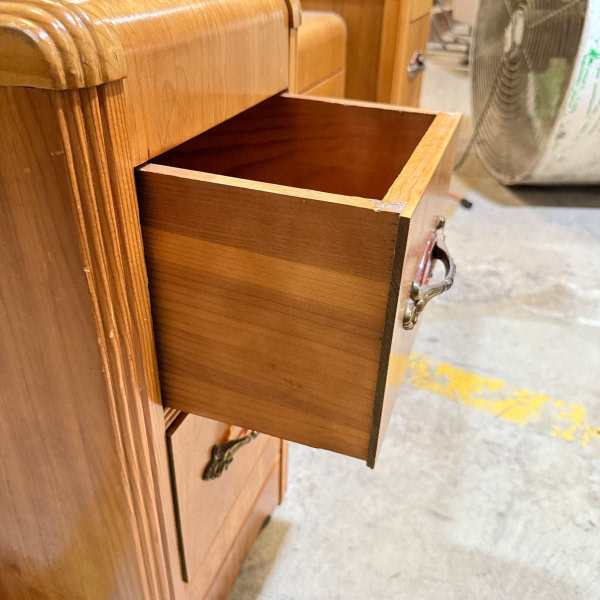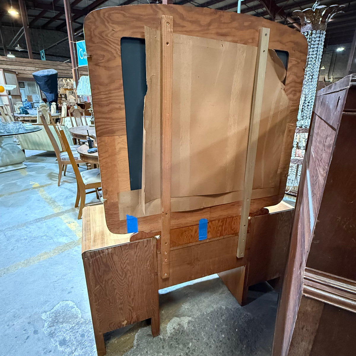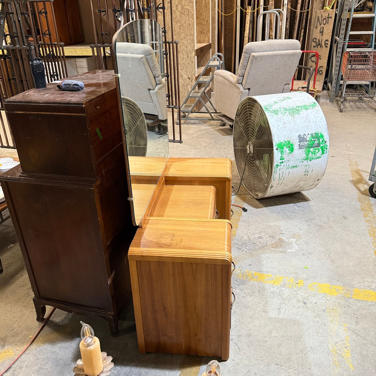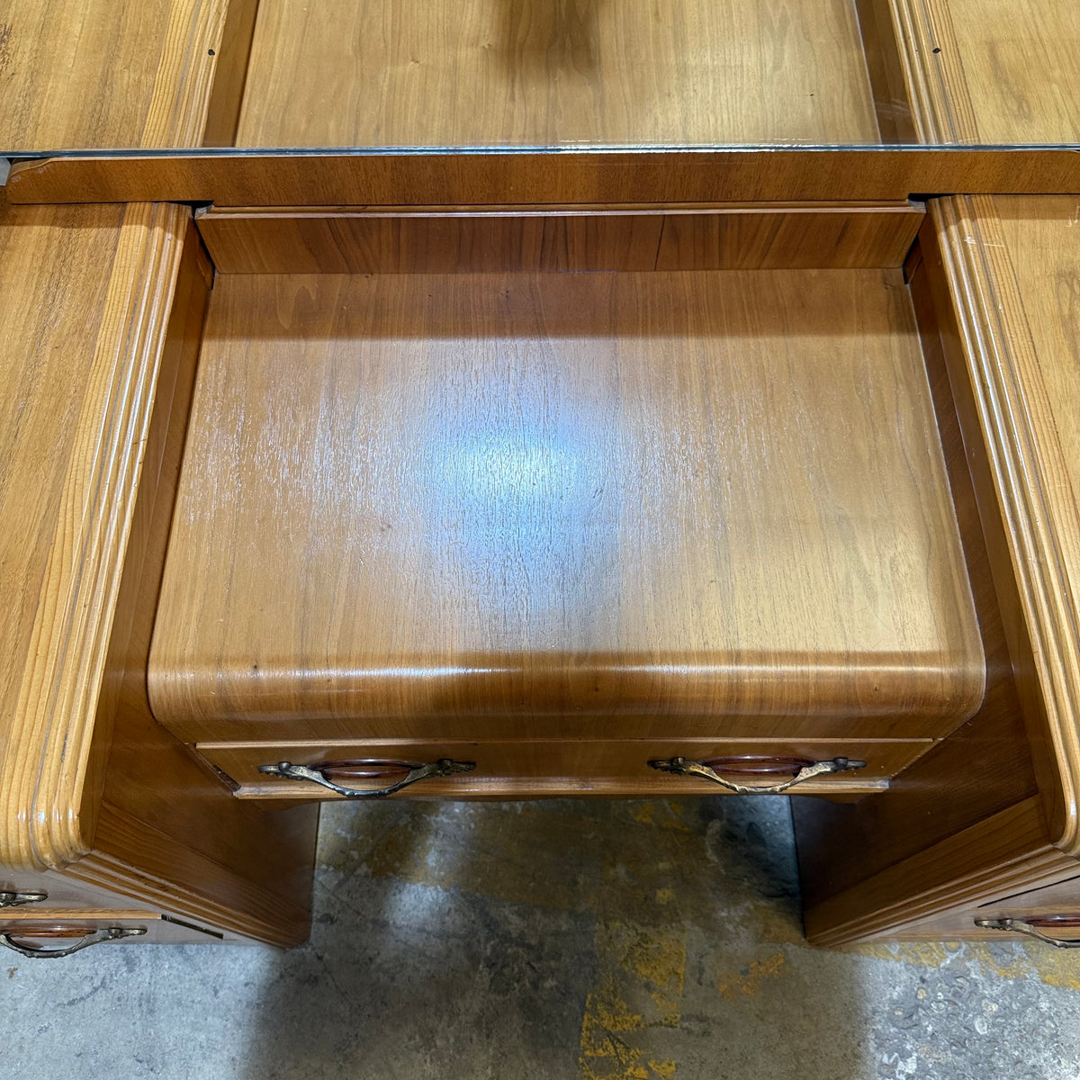 This vintage vanity features a waterfall edge across the front and a large mirror attached to the back. The base contains a small center drawer and a stack of two larger drawers at either side with brass pull hardware. The mirror can be detached for moving.