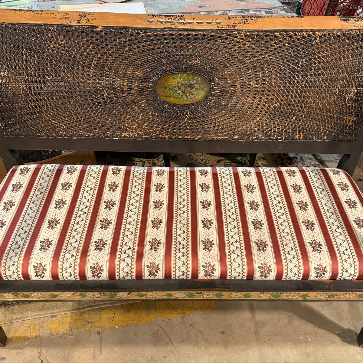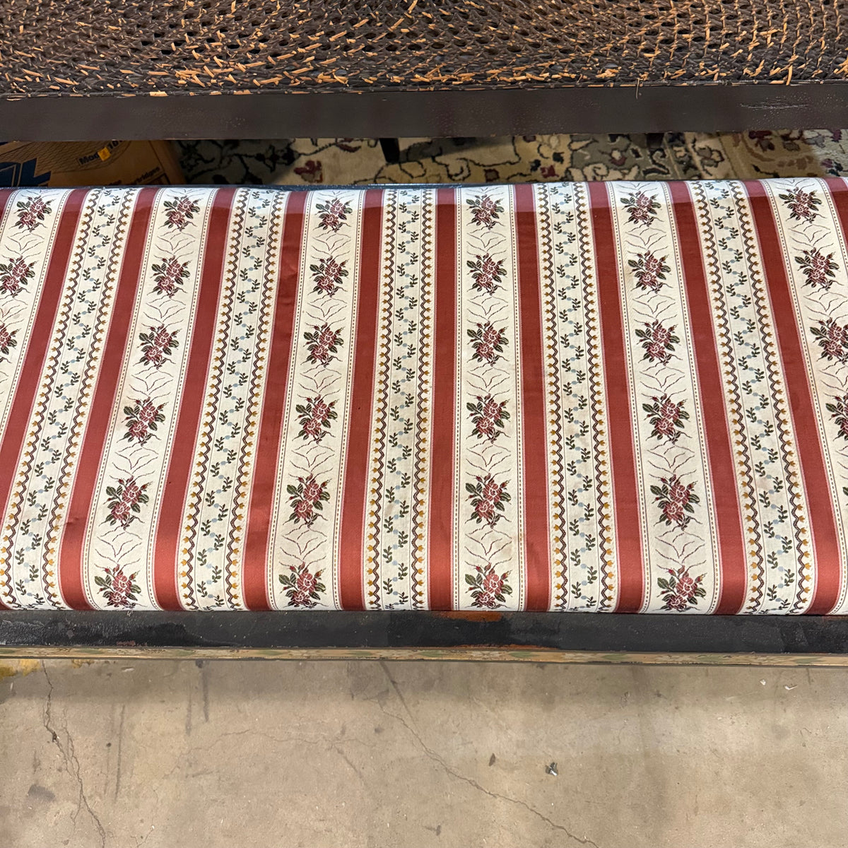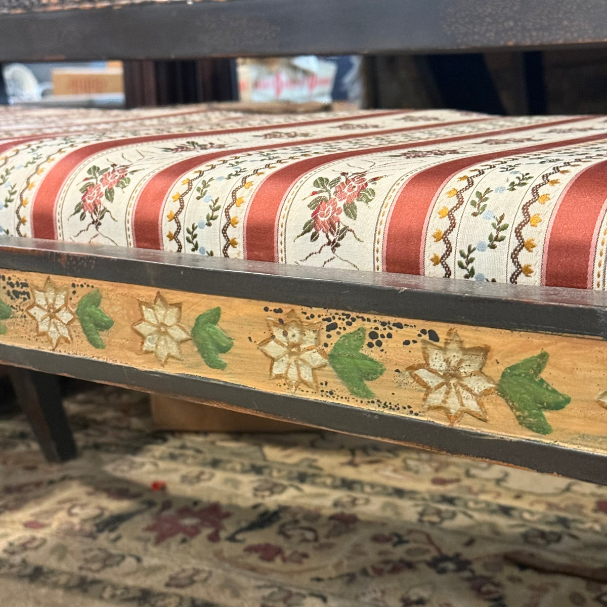 This product is a previously owned vintage carved wooden bench that has been finished in a distressed/rustic style. It sits on straight, carved feet and features an affixed seat cushion upholstered in a striped and floral patterned fabric.