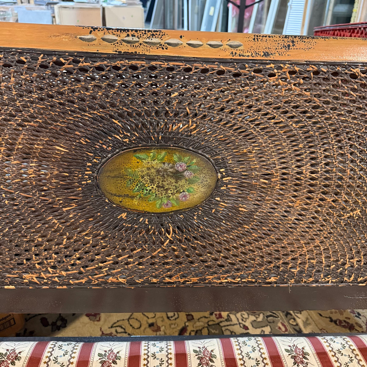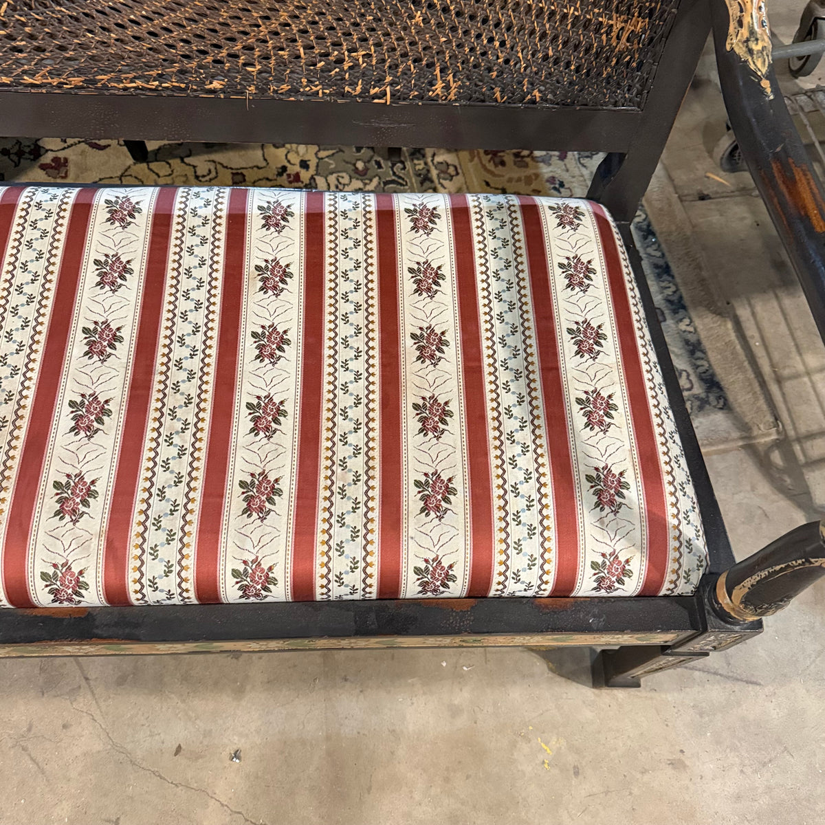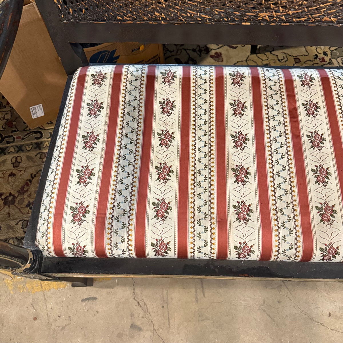 This product is a previously owned vintage carved wooden bench that has been finished in a distressed/rustic style. It sits on straight, carved feet and features an affixed seat cushion upholstered in a striped and floral patterned fabric.