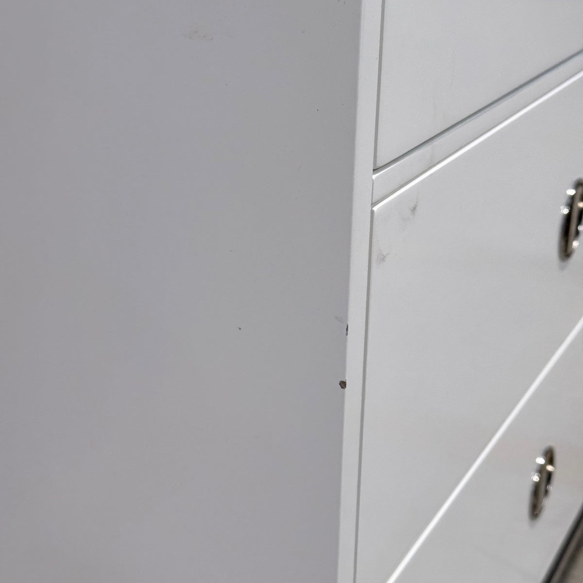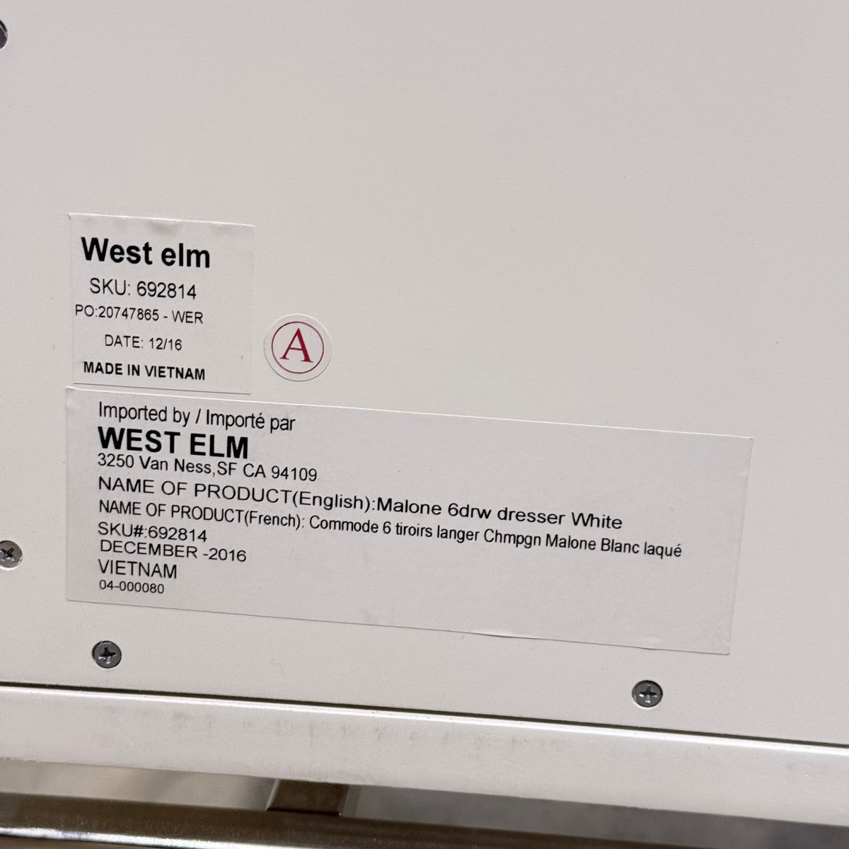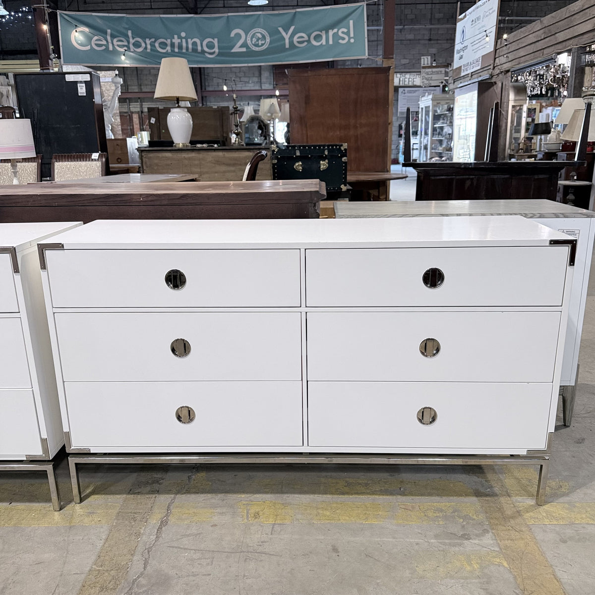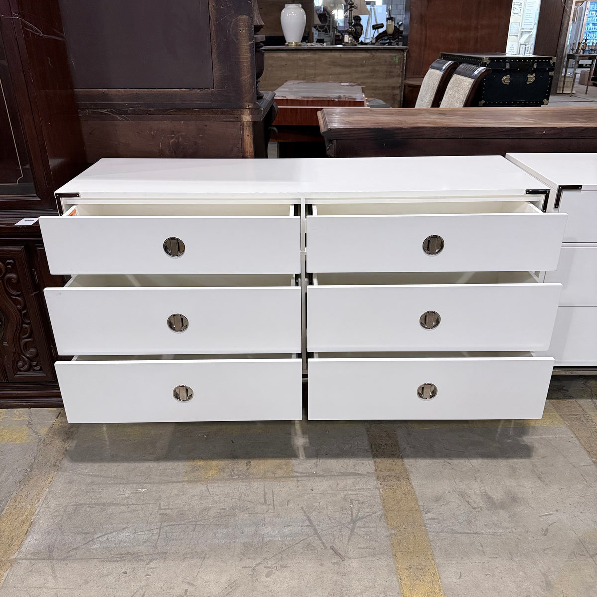This product is a previously owned white, campaign-style dresser by West Elm from their 'Malone' collection. The dresser contains a total of six, spacious drawers and is finished in a white lacquer. The drawers are finished with polished nickel, campaign-style recessed pulls that match the corner bracket hardware and the stretcher along the base.