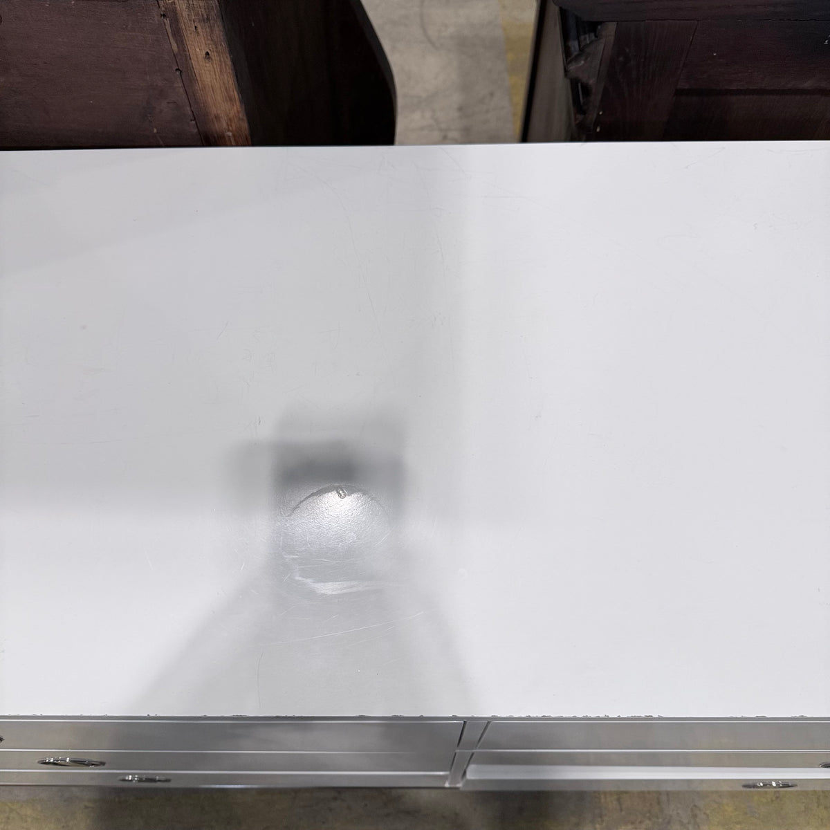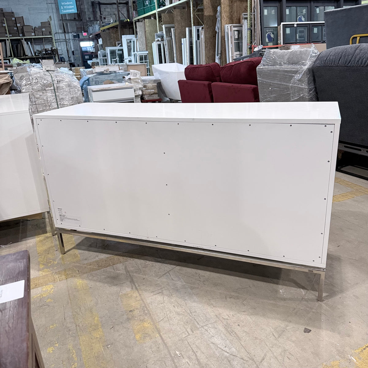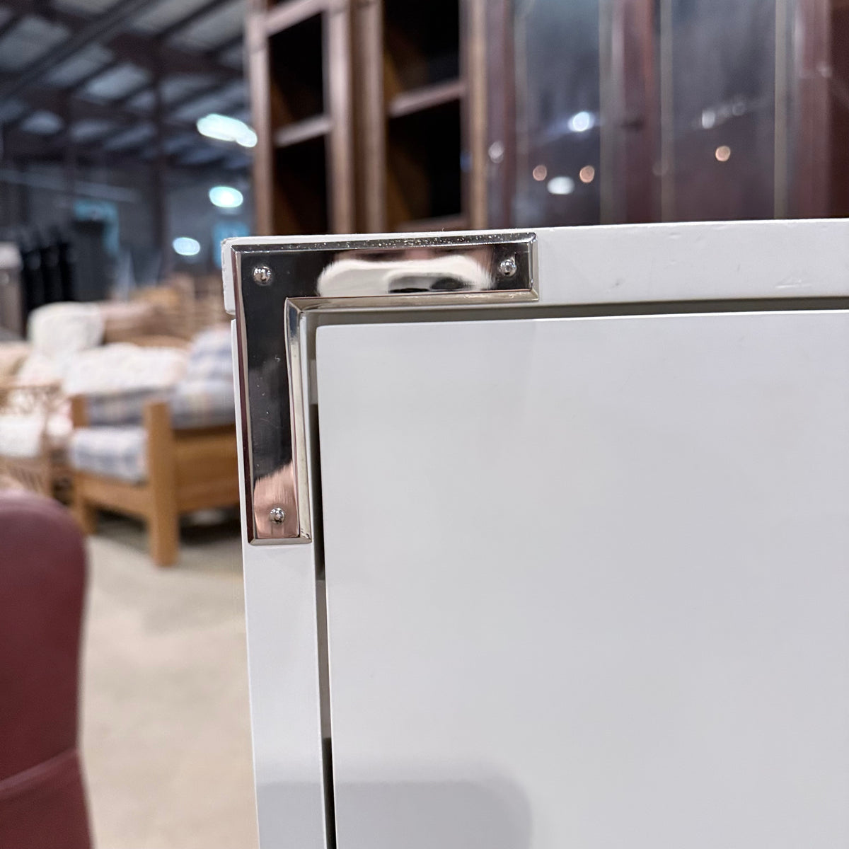 This product is a previously owned white, campaign-style dresser by West Elm from their 'Malone' collection. The dresser contains a total of six, spacious drawers and is finished in a white lacquer. The drawers are finished with polished nickel, campaign-style recessed pulls that match the corner bracket hardware and the stretcher along the base.