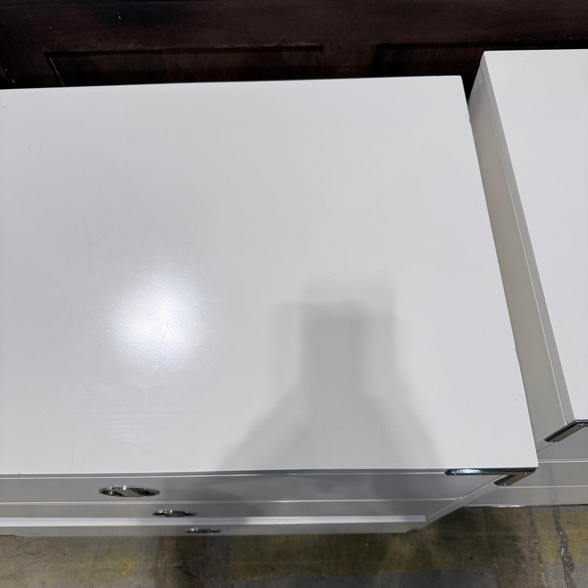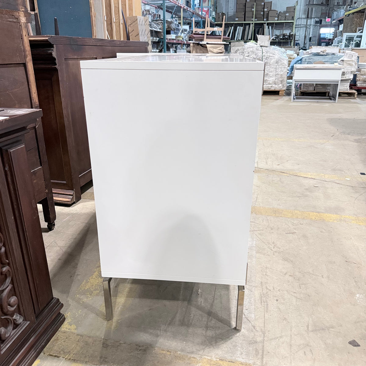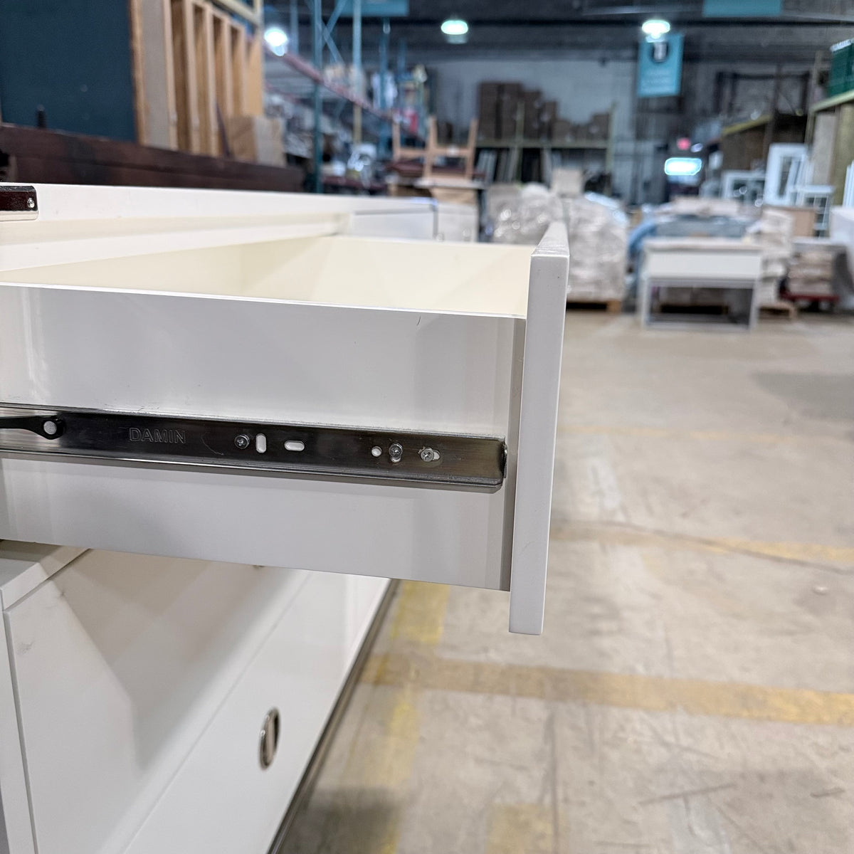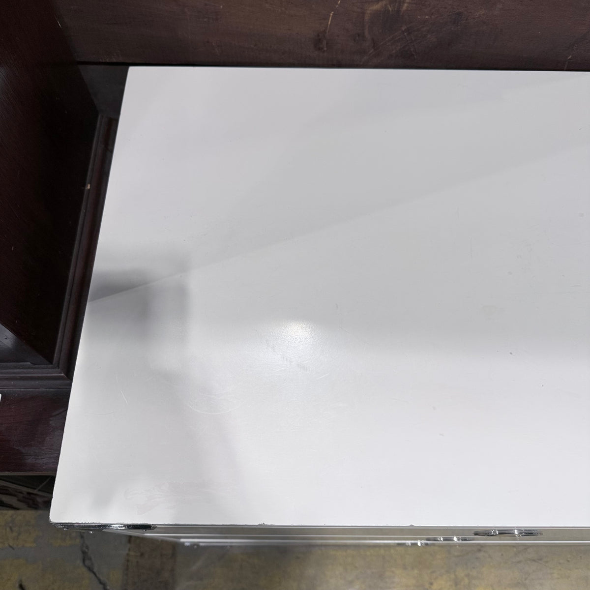 This product is a previously owned white, campaign-style dresser by West Elm from their 'Malone' collection. The dresser contains a total of six, spacious drawers and is finished in a white lacquer. The drawers are finished with polished nickel, campaign-style recessed pulls that match the corner bracket hardware and the stretcher along the base.