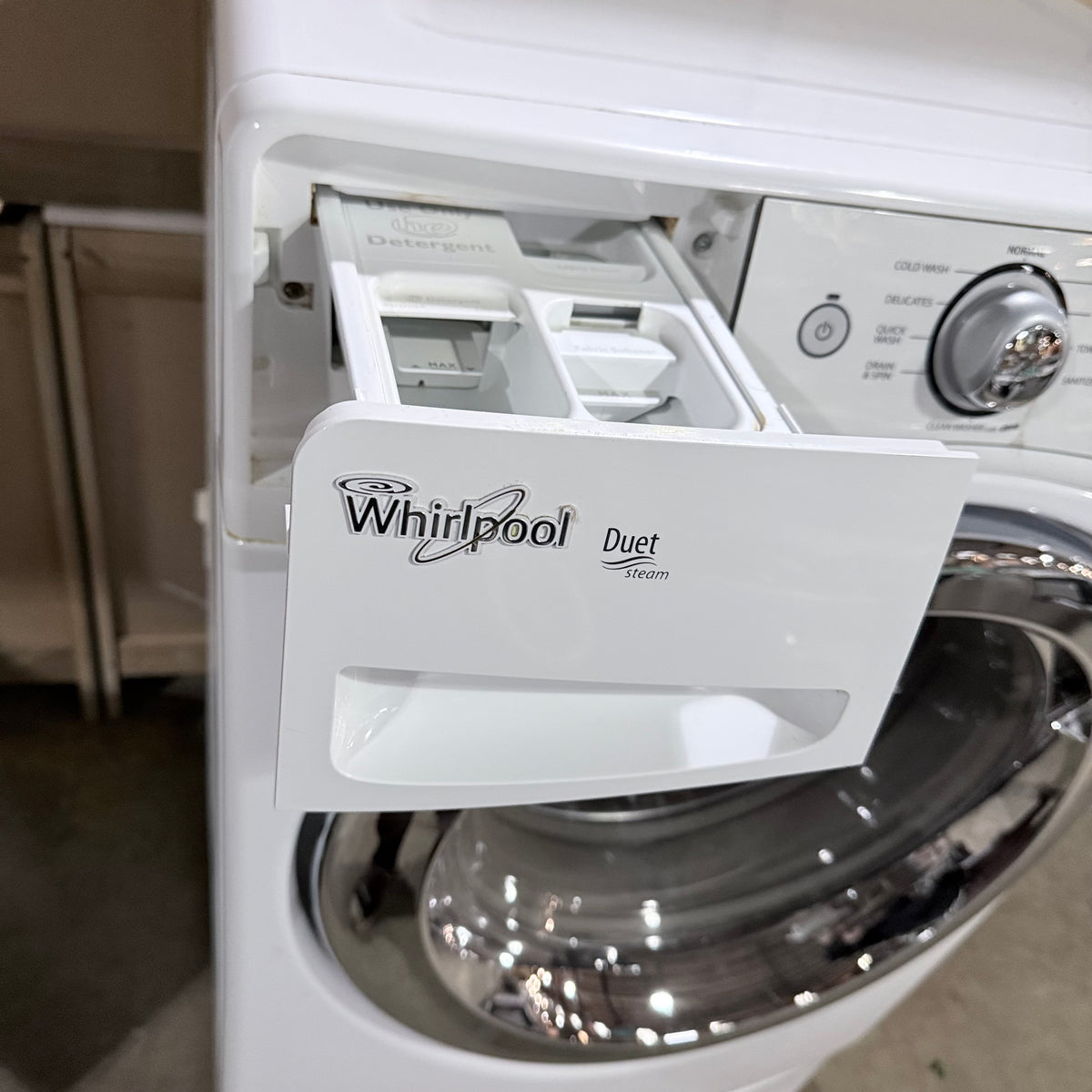 This product is a previously owned Whirlpool Duet® steam front-loading washing machine. Features: