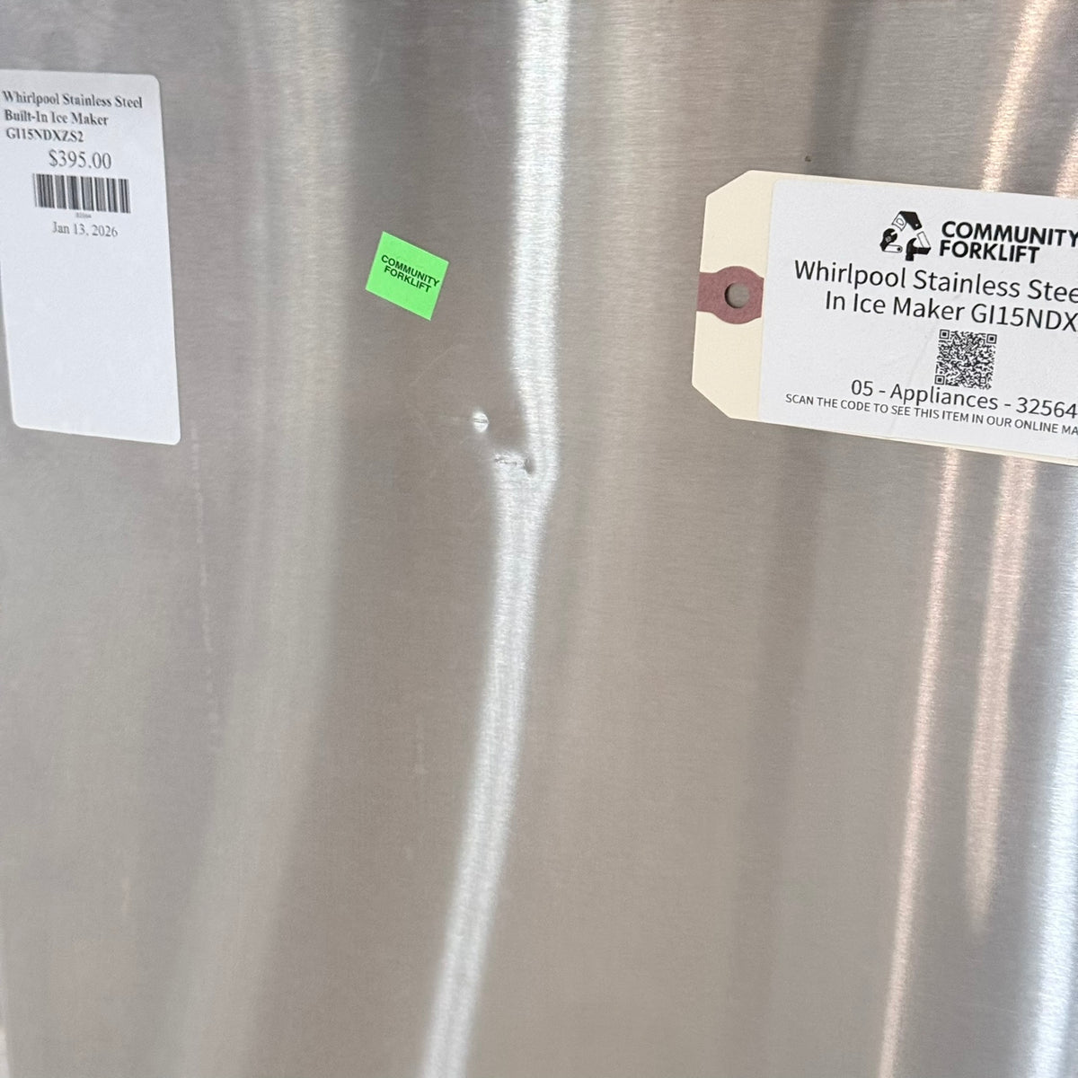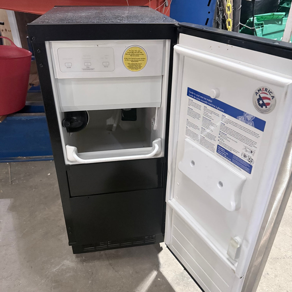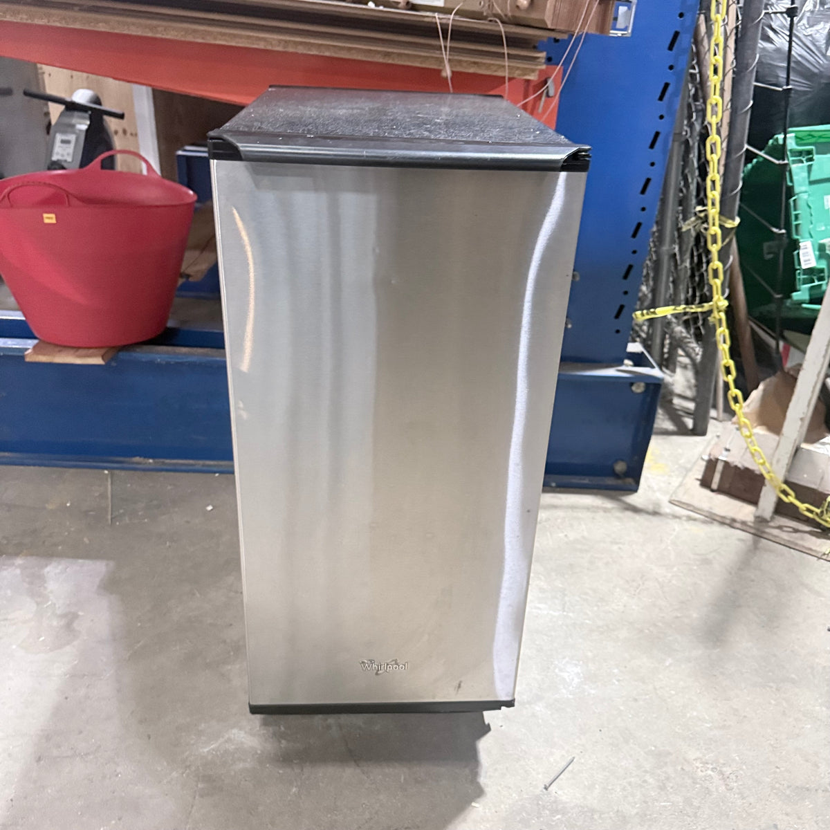 This product is a previously owned stainless steel Whirlpool built-in ice maker. Features: