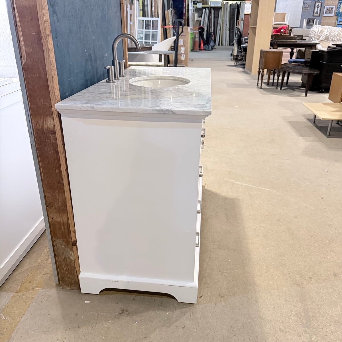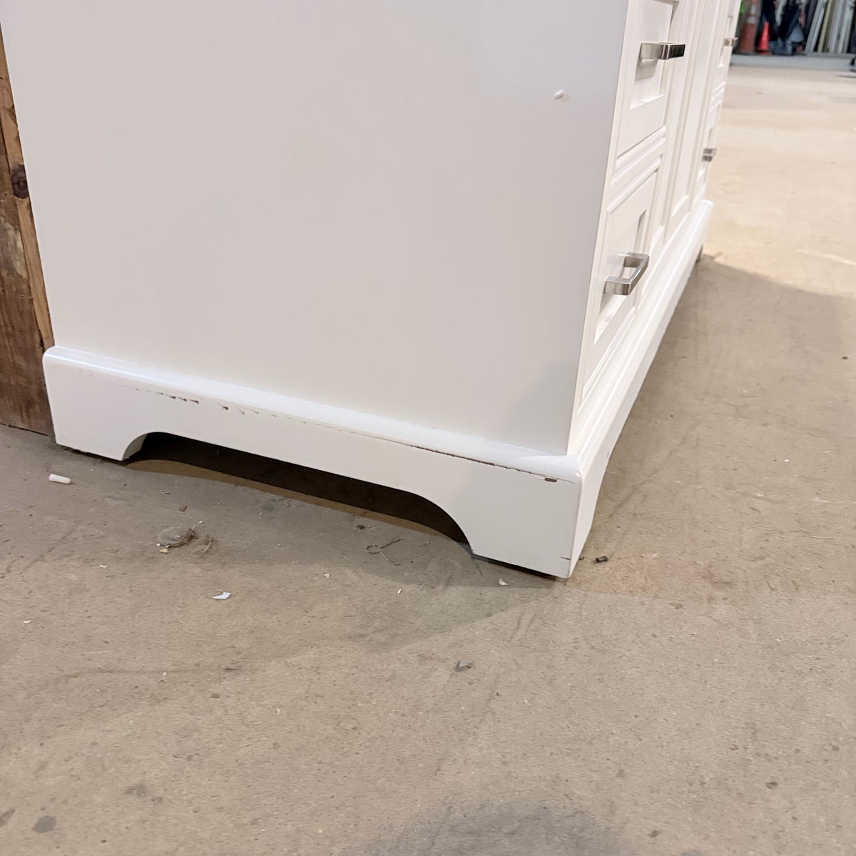 Please note, there are a few black scuff marks along the base on the left side of this vanity's base. There are also a few scuffs/scratches to the countertop from previous use and deinstallation (see photos).