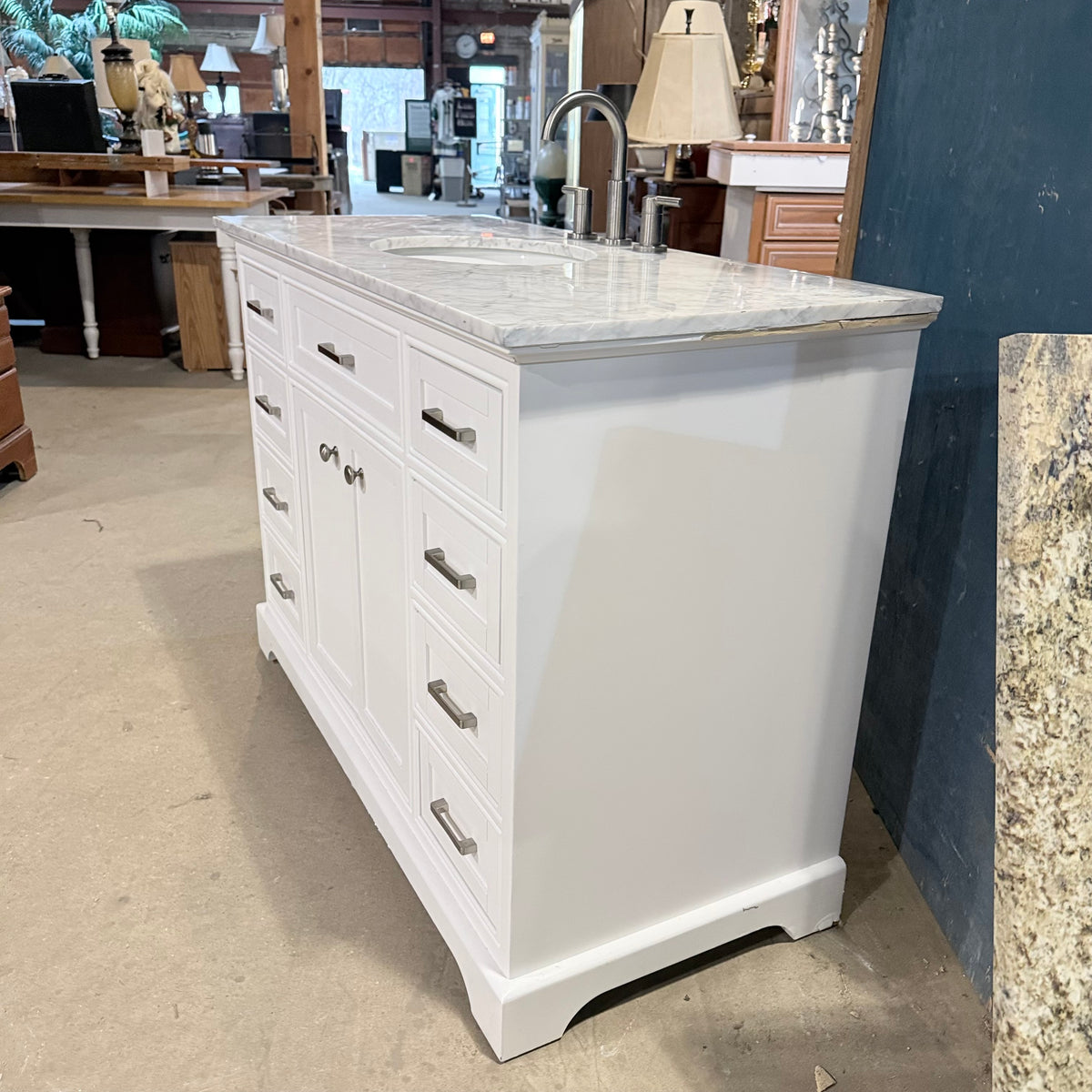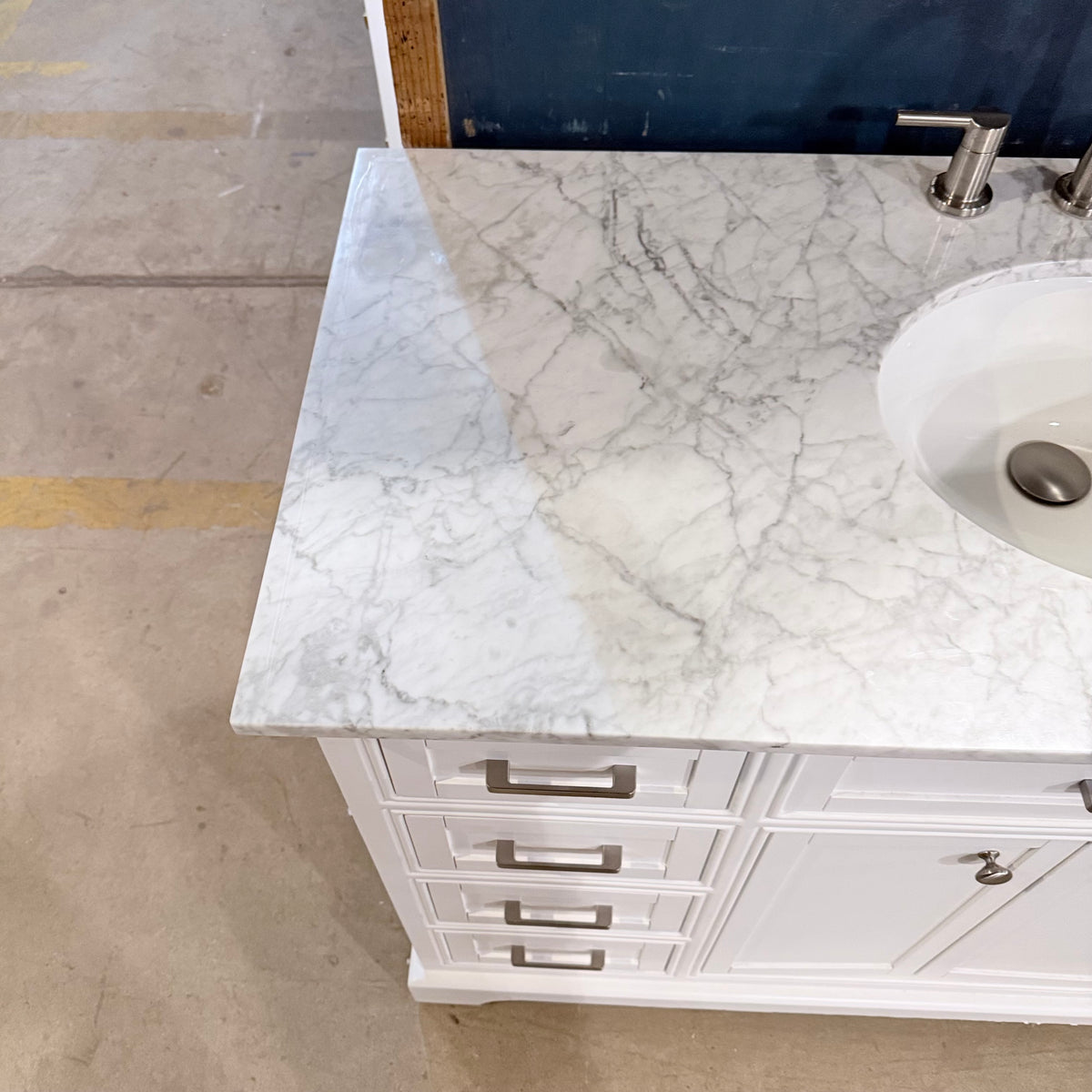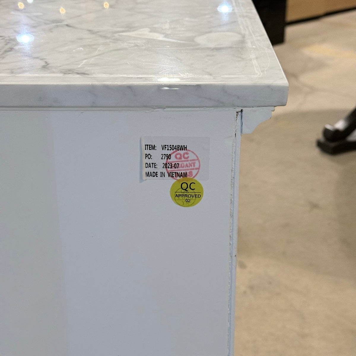 This product is a previously owned, white 48" freestanding single bathroom vanity by Elegant Lighting's 'Americana' collection. Features: