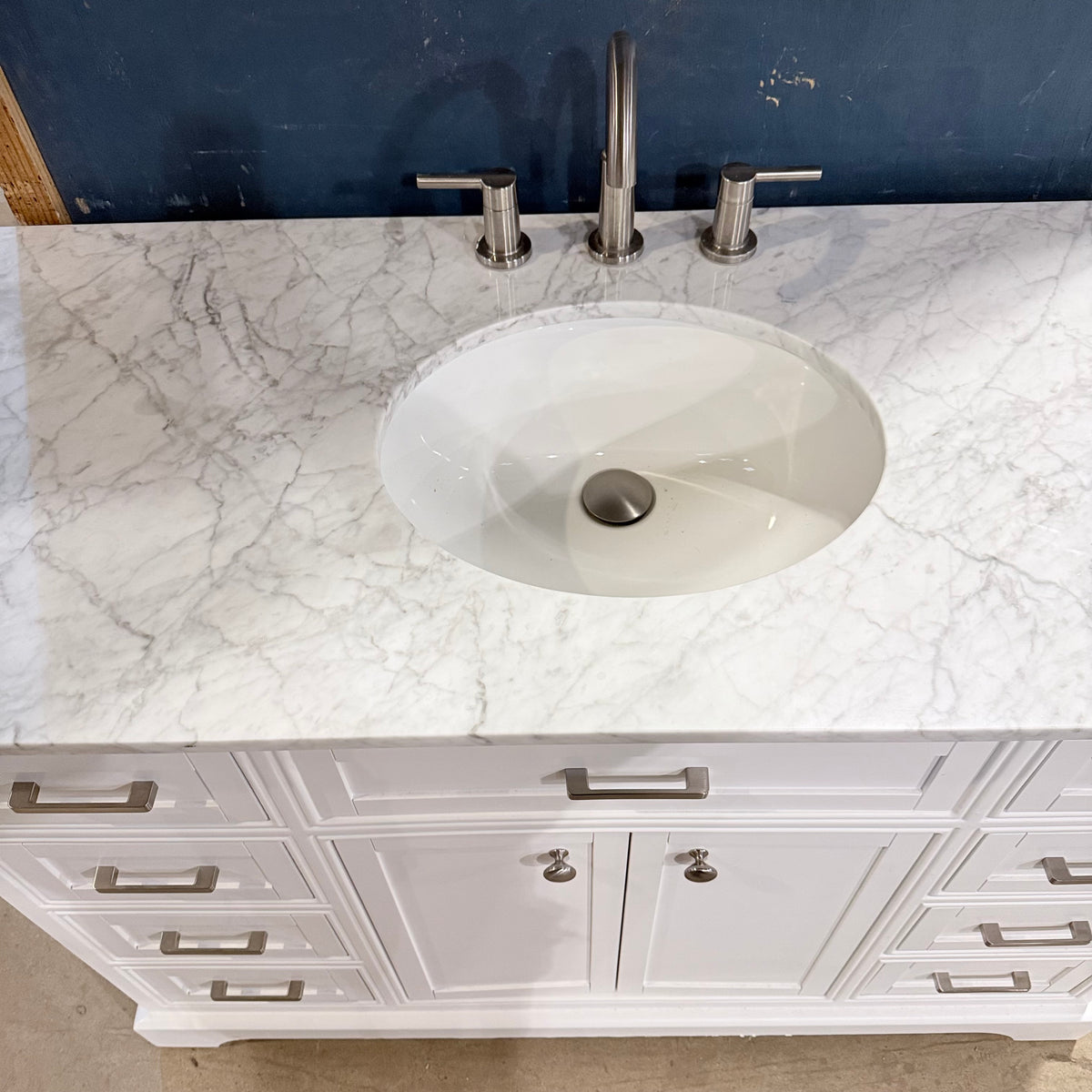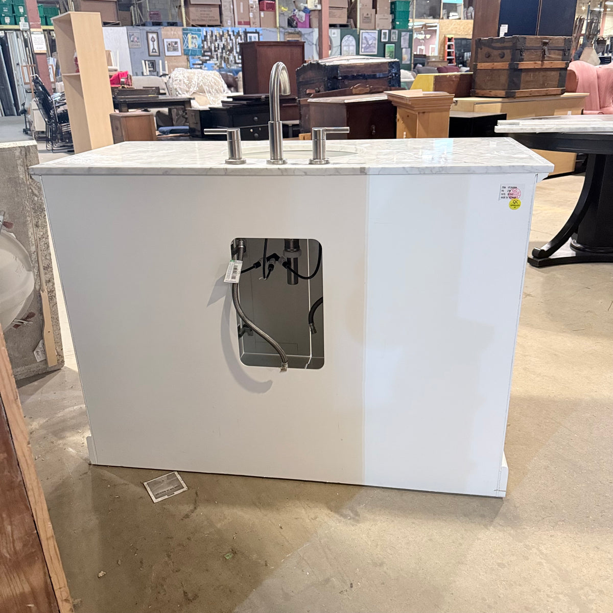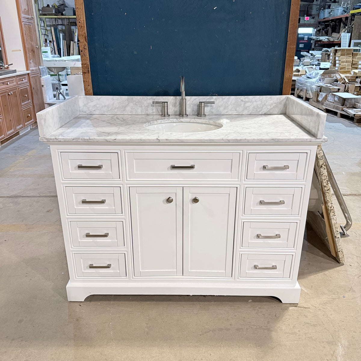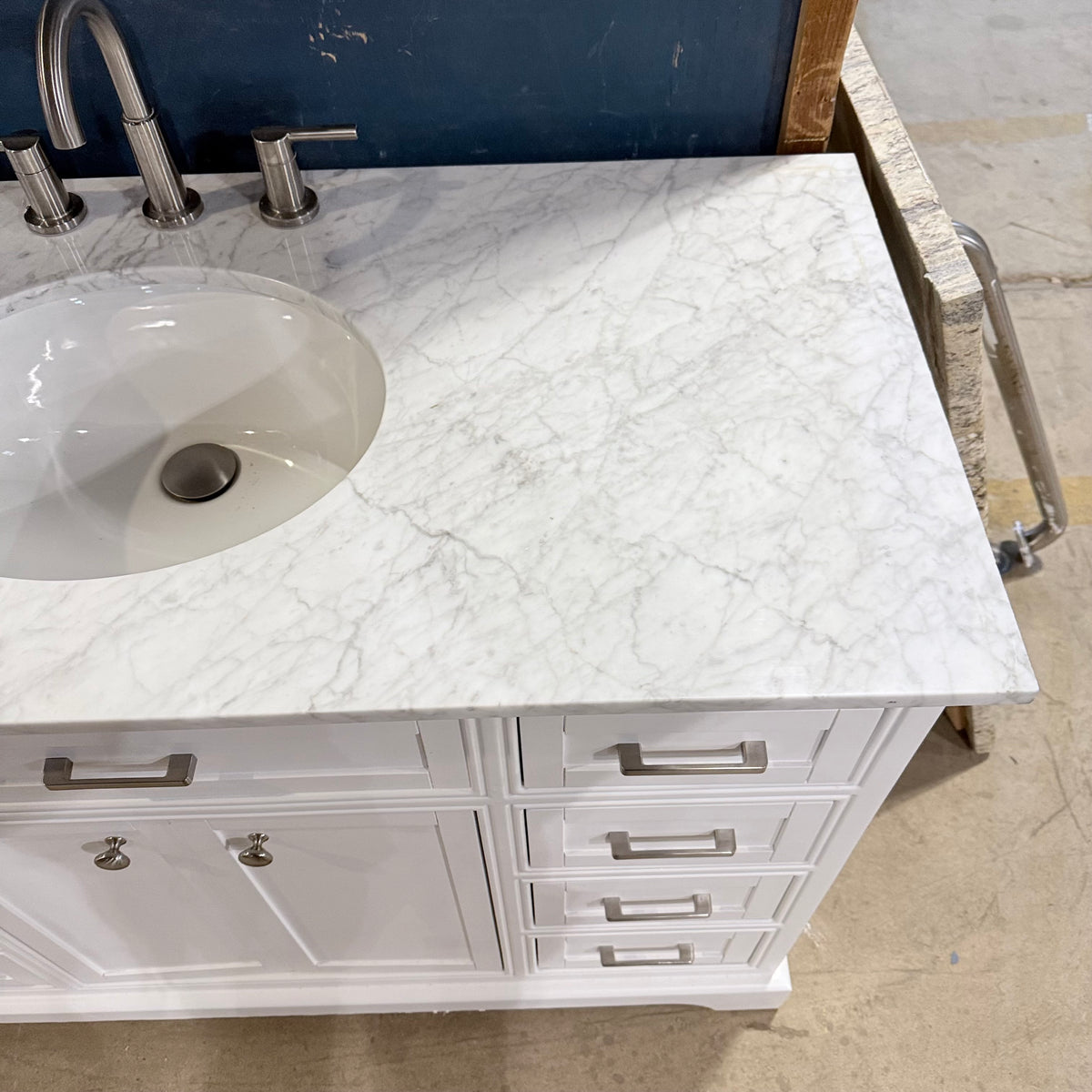 This product is a previously owned, white 48" freestanding single bathroom vanity by Elegant Lighting's 'Americana' collection. Features: